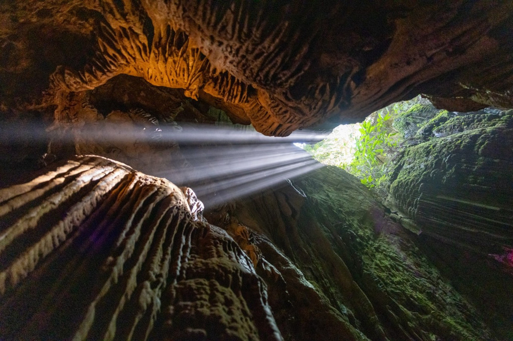 石头光滑湿润,像瀑布,像珊瑚,充满动态美感,实则都精致悬挂在半空。洞内迂回曲折,前方不知踪迹,就向前走着,狭窄的地方阴暗潮湿,广阔地带像进入繁星秘境广场,出口处看到一束阳光直射进来,充满着希望的力量。