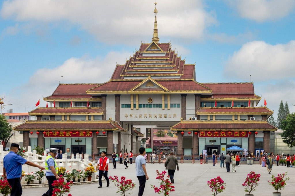 瑞丽姐告国门是游客来到德宏必打卡的地标之一,走过三年萧条时光,如今广场上又恢复了一派热闹景象。商人本地人聚集于此,游客在这里成群结队与国门合影拍照。