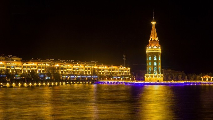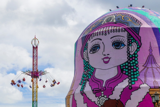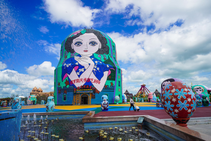 进入 俄罗斯 套娃广场,最中央的建筑物如下,三个边分别是: 中国 , 俄罗斯 和 蒙古 。 景区由主题公园,主题娱乐场所,主题酒店组成。