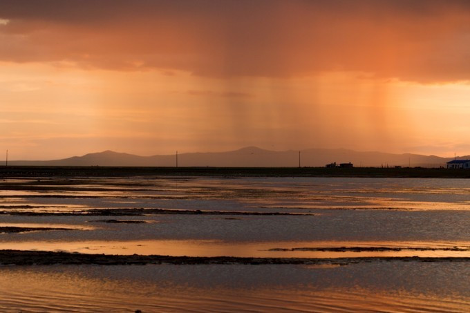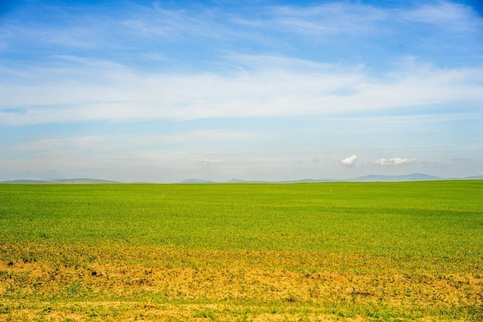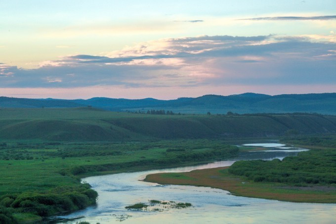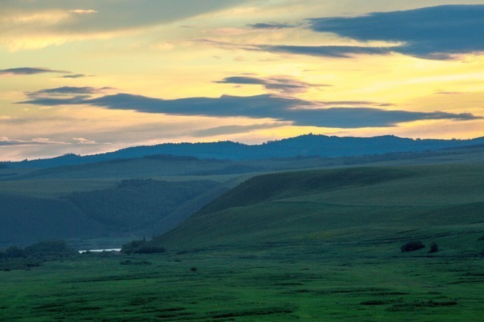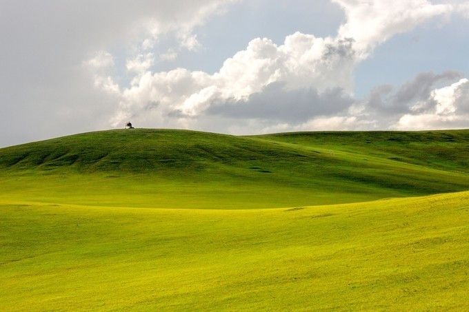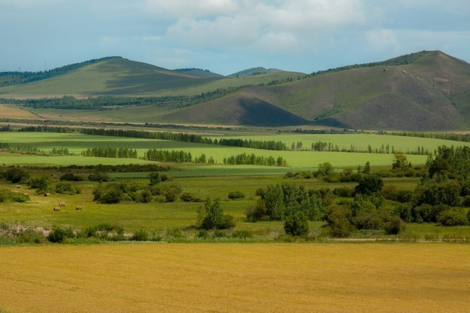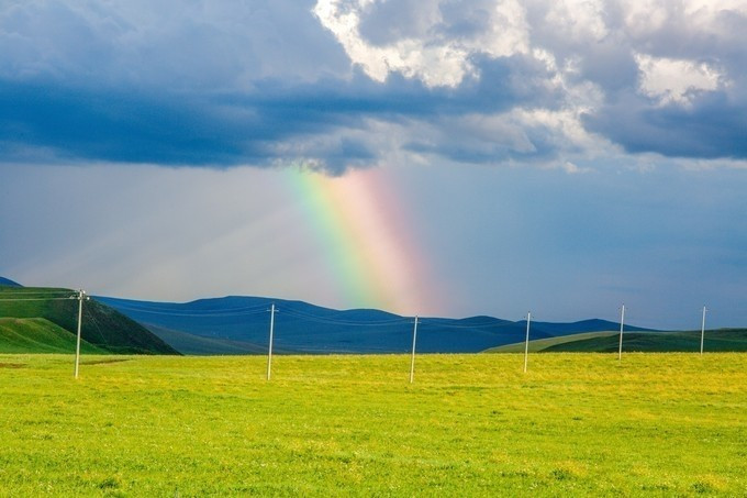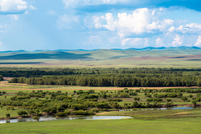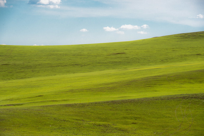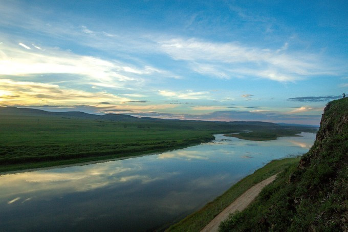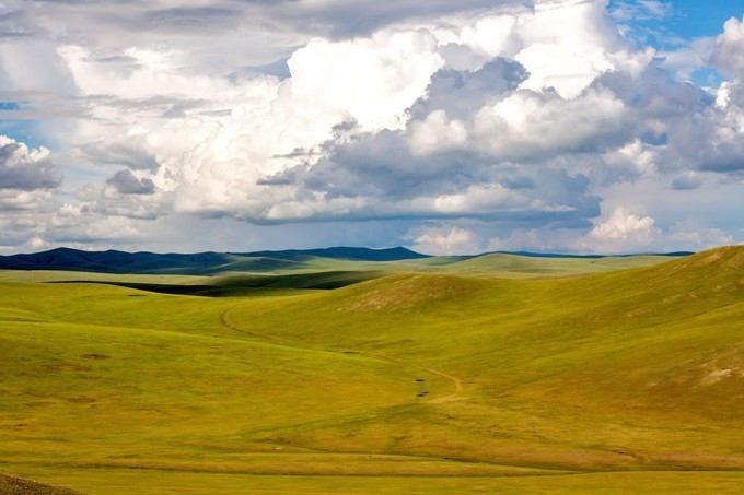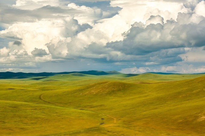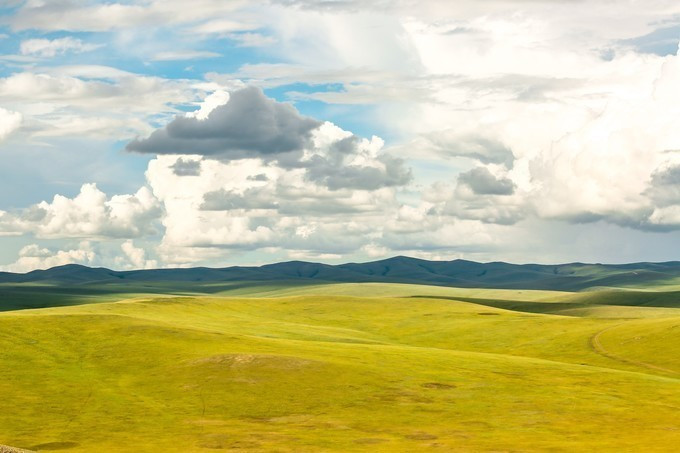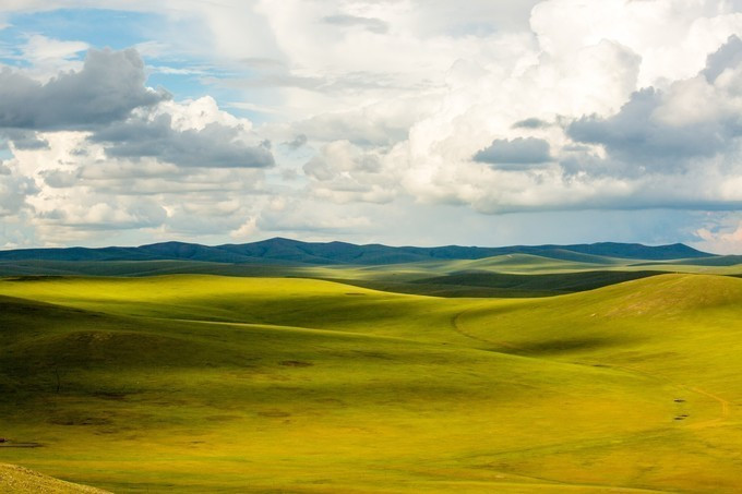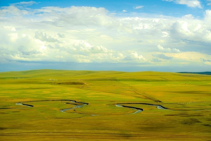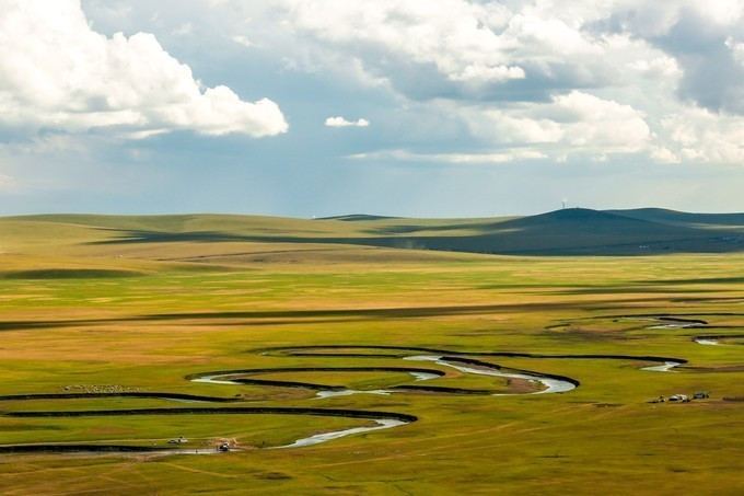 你可以看到草地上云雾的阴影,还有成群的牛和绵羊散布在广阔的草原上 看到光与影的流动莫日格勒河