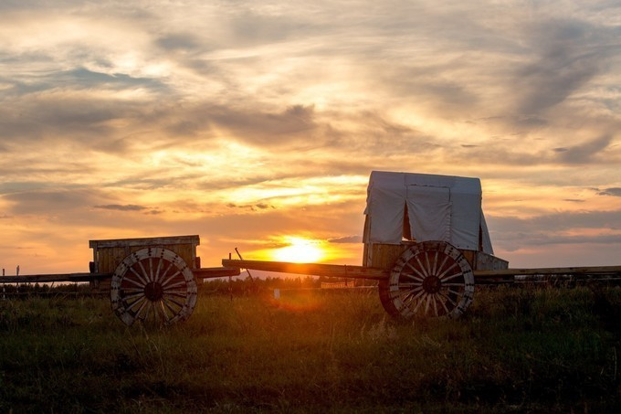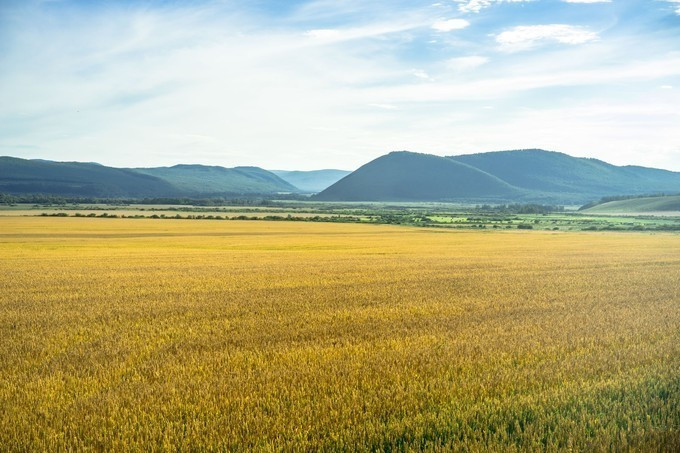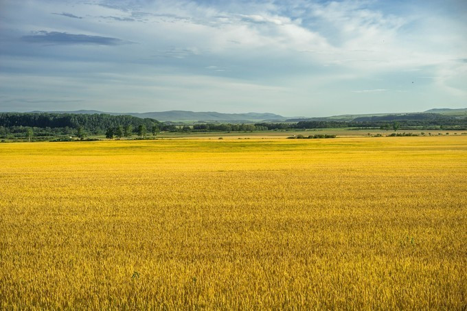 在蓝天下,绵延无尽的麦浪中,白云低垂在头顶上方,仿佛你可以用手伸手去