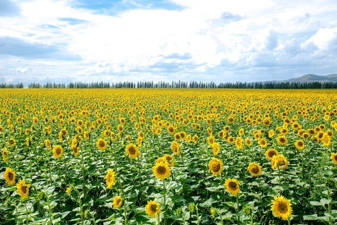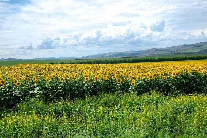 向日葵田在绿荫中,一片灿烂的金色世界,向日葵就这样跳入眼帘。