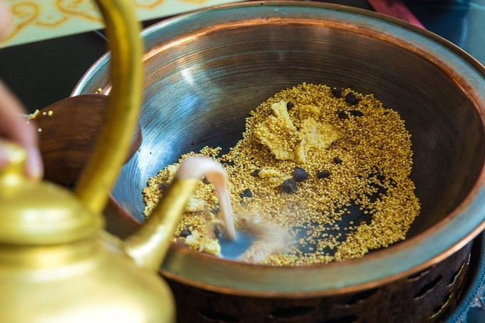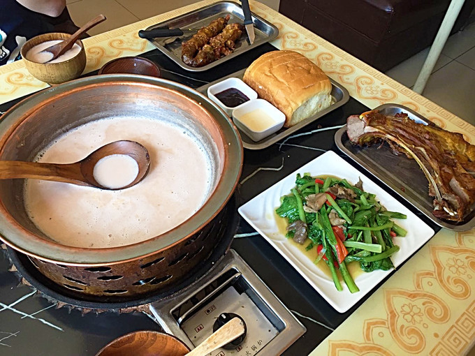 告别莫日格勒河,我们回到 海拉尔 。海拉尔的一餐我们的行程即将结束,我们也决定再吃一顿当地的特色餐。 雪峰哥推荐我们去的是 海拉尔 有名的一家餐馆,试一试这里的锅茶。 这里的奶茶不是我们的传统奶茶,而是咸的。