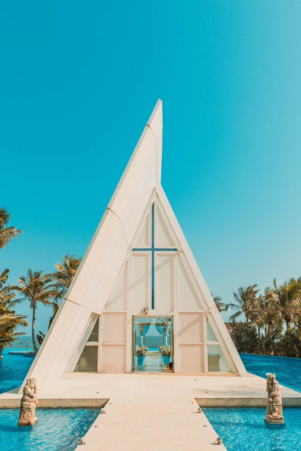 教堂的内部是采用白色的装璜,更大量使用透明玻璃,地板则是白色 大理 石铺成,三角形的穹顶巧妙的搭配着,使整个内部犹如水晶般的透明清亮.教堂内透明的宾客椅,衬托着美丽的鲜花,仪式台以白色木制成,在此举行婚礼,不仅浪漫,更显新人的独特风格。