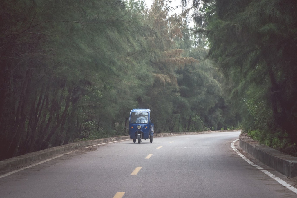 各种卖椰子、小吃、沙滩玩具、贝壳工艺品的三脚鸡(电动三轮车)停满了沙滩