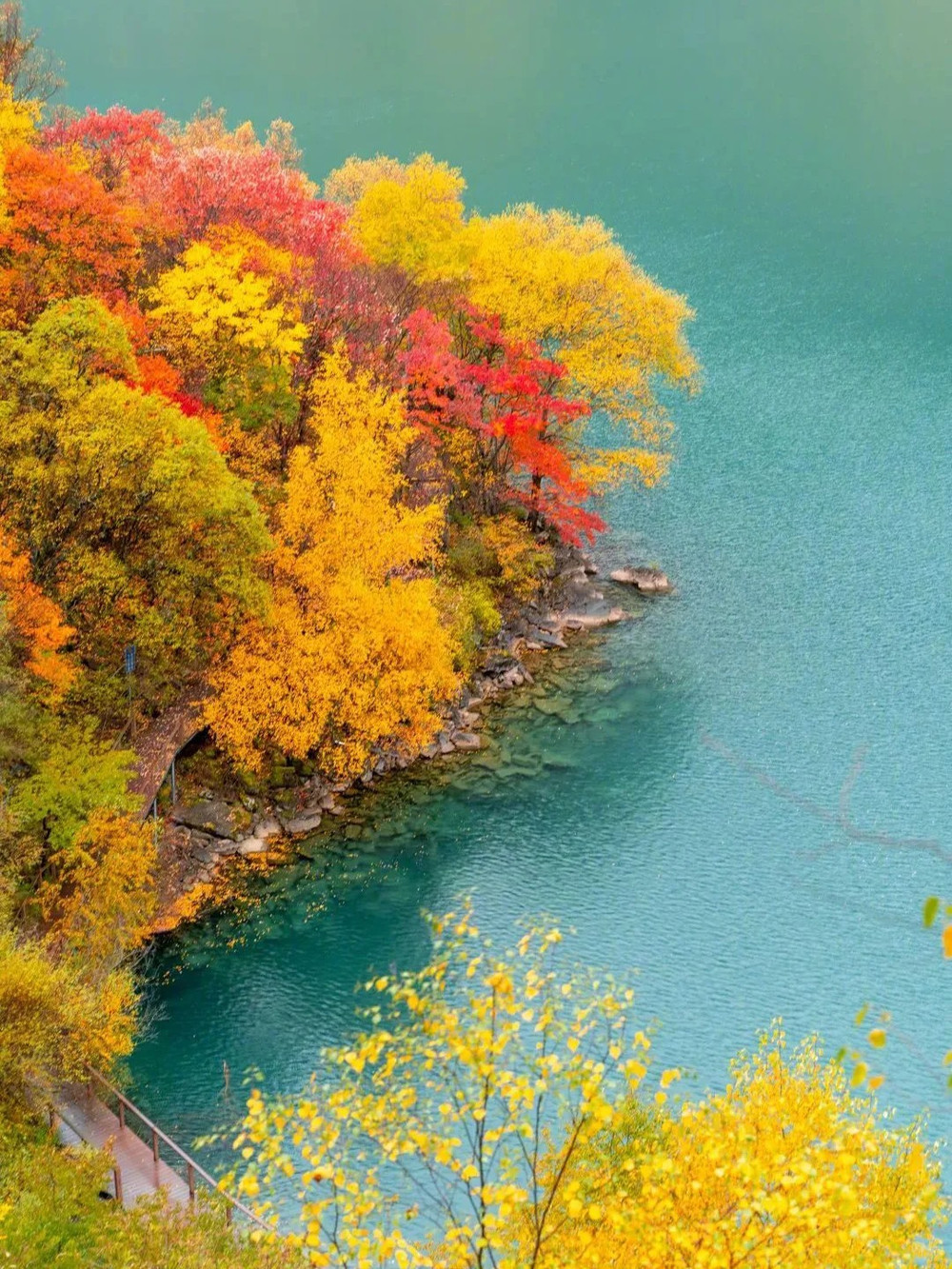 从一叶知秋到层林尽染,这里的秋景堪称无敌,红的、黄的叶子与蓝的、绿的湖水连接广阔的天空,水天一色!