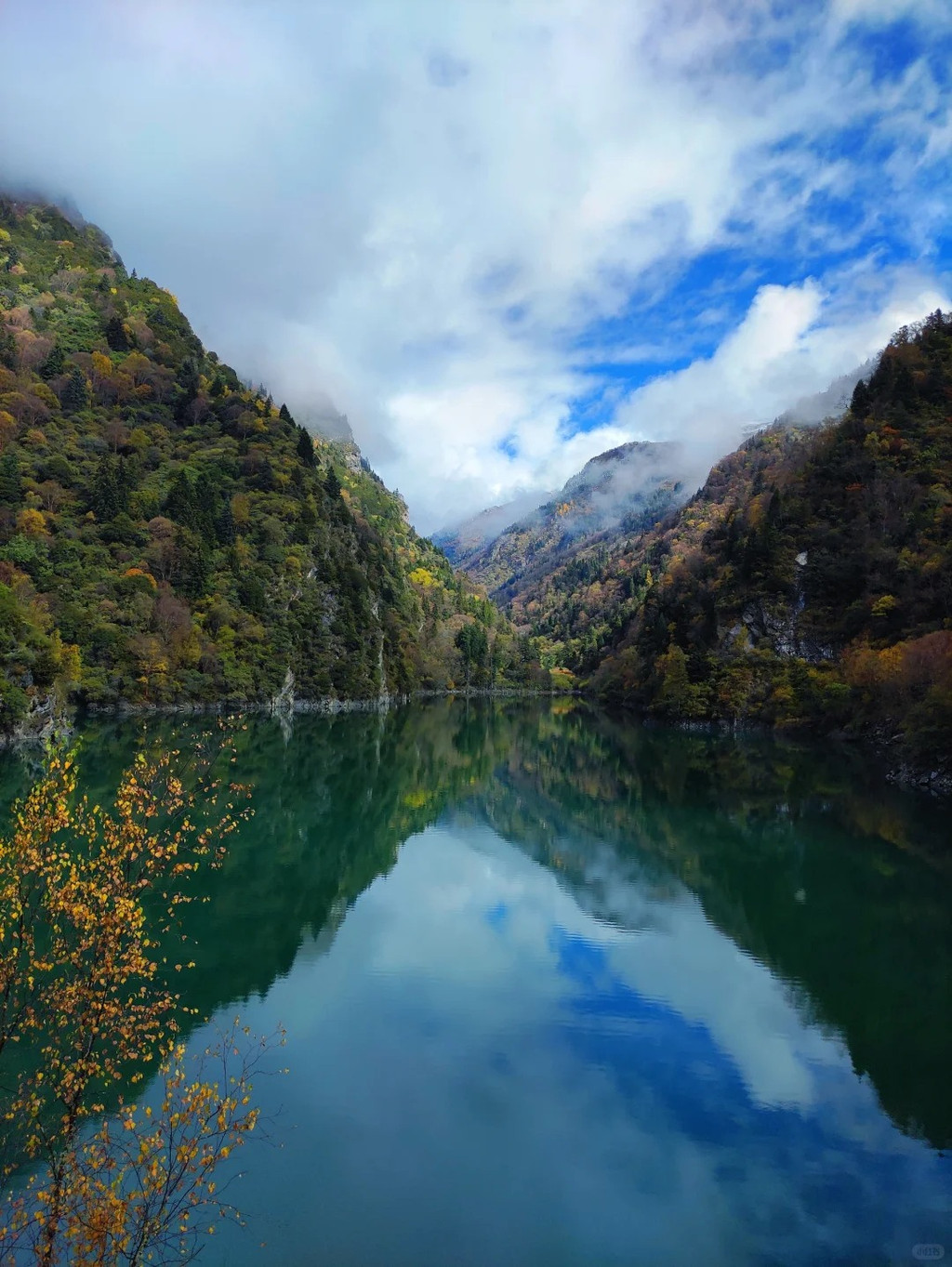 在松坪沟这里有碧绿的湖水,能倒映蓝天白云,像一面巨大的天然镜子。 四周是层林尽染的彩林和连绵的山脉,随手一拍都像明信片!