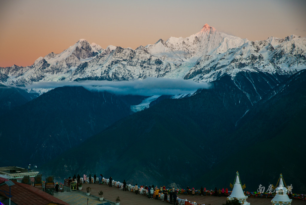 这不,太阳投射过来的那一刻,下面的观景平台已经聚集了许多人,而我也已经是第五次来到这座神山脚下了。2012年11月去雪山脚下的雨崩徒步,在飞来寺逗留,看到了日照金山;从雨崩回程,阴天;2016年从西藏阿里回来经过这里,云雾缭绕;2020年5月香格里拉大环线经过飞来寺,恰逢雨季,但是我找到了一个角度最好的酒店。