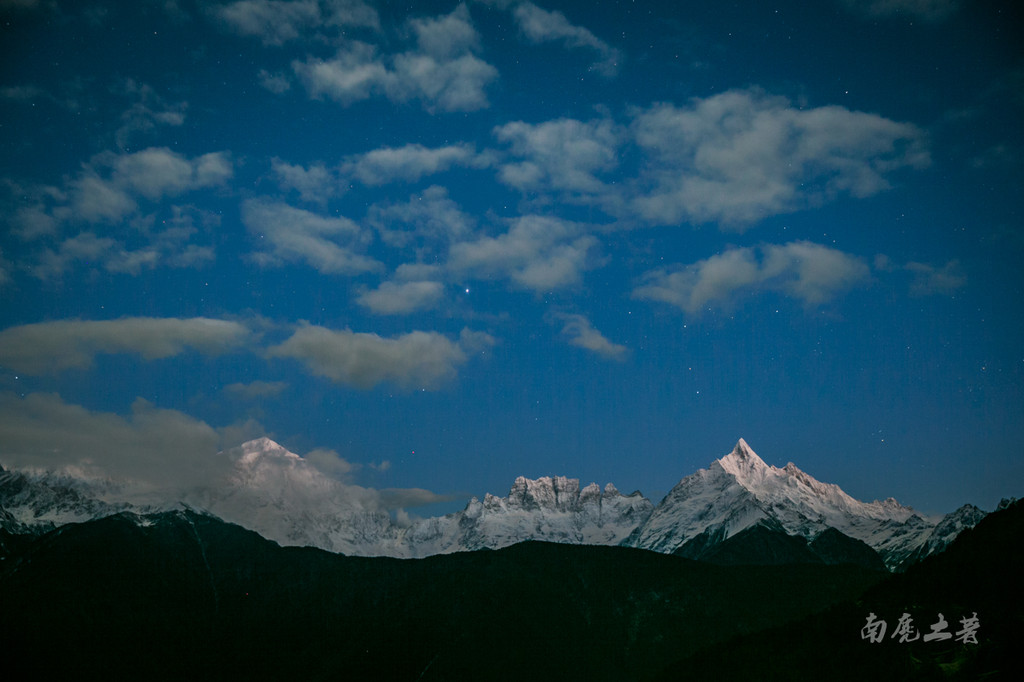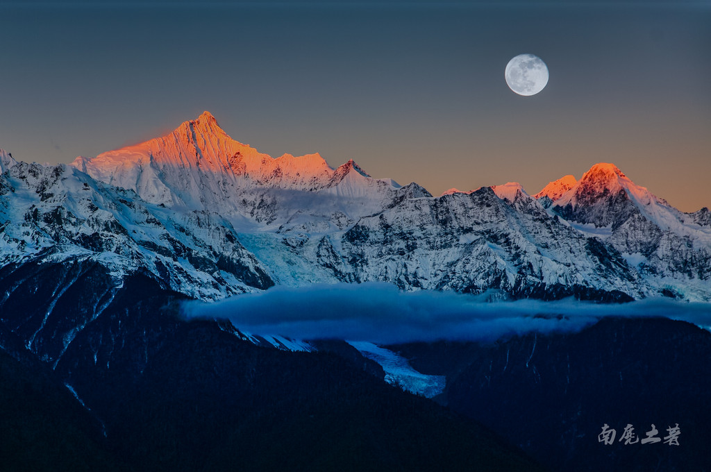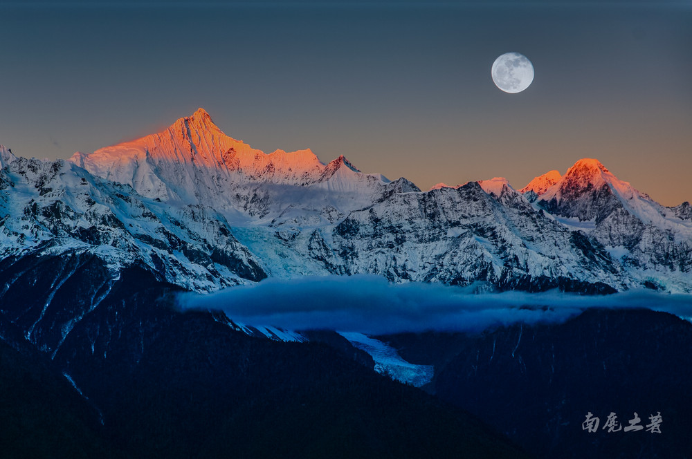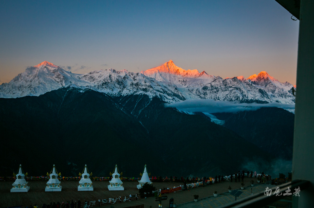 雾浓顶,因海拔高,多云雾而得名的吧,果然和飞来寺不一样的是,这里的雪山不是先由白到红,而是在天亮前一直保持着粉红的颜色,梅里变得神秘起来,场面如临仙境。