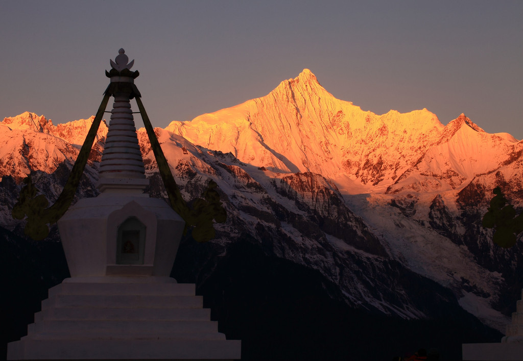 冬季的德钦,清晨的温度已经零下,摸黑的飞来寺观景平台前,首先是雪山把黎明照亮,当整个的山脉轮廓清晰时,第一缕阳光便把梅里主峰卡瓦格博点燃,就像苍茫旷野一擎星火燎原的火炬,之后火红的光线迅速下移铺展开来,像一幅开启新的一天的大幕,顿时整个山谷一片金光,人们齐声欢呼,这个只有10分钟的日照金山,是期待已久的最壮丽的时刻。
