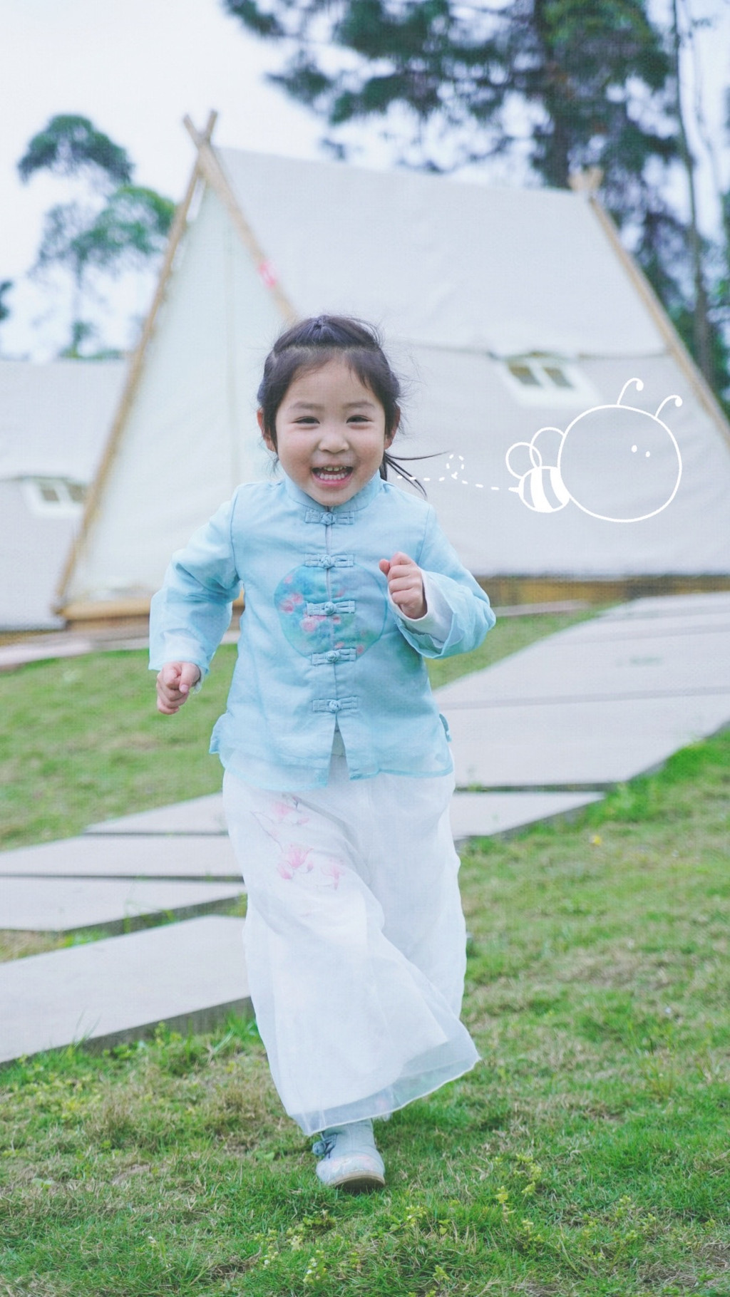 在一片空旷的草地里面坐落着几台房车还有几十个三角帐篷,有机会一定带小朋友来体验一下在野外露营的乐趣。