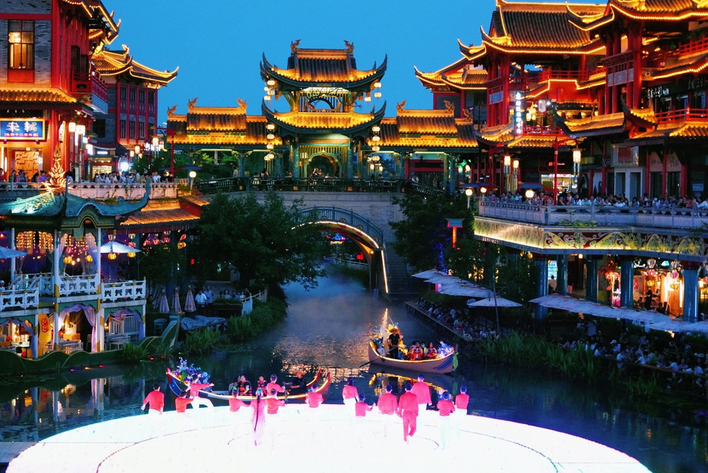 夜幕低垂,华灯初上。原本平淡无奇的穿越盛世水街,因为万家灯火显得格外迷人。一条弯弯曲曲的河道,几座古色古香的廊桥连接了河畔两岸。沿岸的商铺从一层到三层,星罗棋布的散布开来,有汉服店、美食店、精品店等。游人们可以站在桥上看风景,也可以乘坐一艘小船靠在舞台边,近距离观赏精彩纷呈的表演。