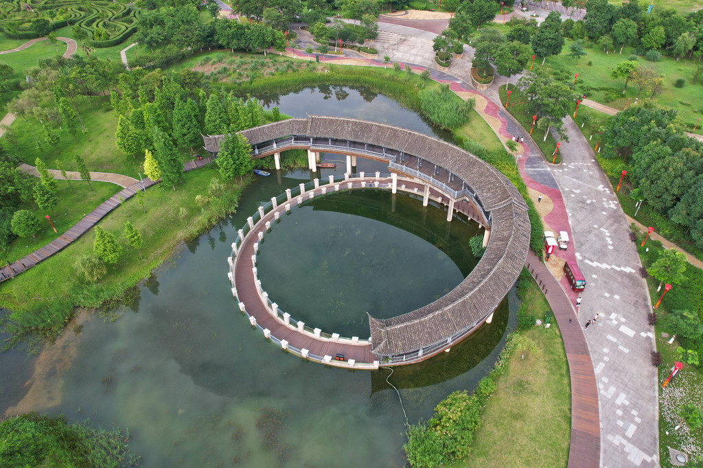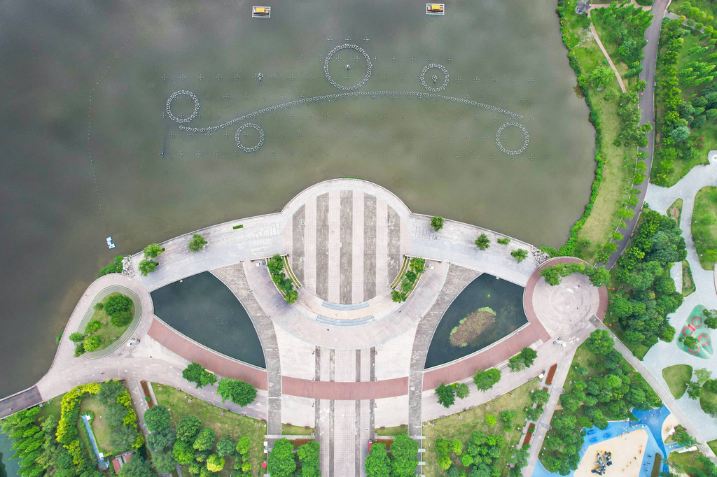 东坡城市湿地公园里,藏着一处眉山版“大鱼海棠”同款的建筑,它就是望月台沉水步道。从高空俯瞰,形如一个反写的“6”,有着与福建土楼般奇特的圆形镂空,可以观赏湖中映日的奇观。一旁则是由玻璃墙垒起来的围墙,湖水透过玻璃墙,就像行走在月光的余晖之下,波光粼粼。
