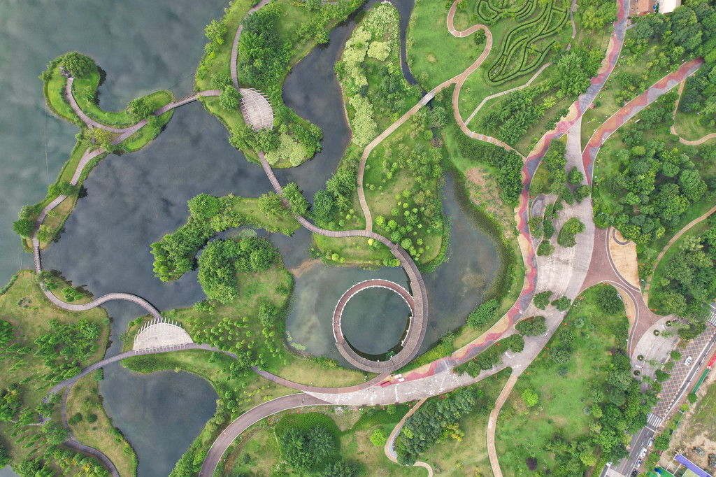 当我们透过玻璃围墙,还能看到湖中鱼遨游而过,有着游览水族馆般的奇妙之感。近年来随着“生态城市、宜居城”概念的兴起,国内城市公园如雨后春笋般勃发。地处眉山的东坡城市湿地公园,在眉山核心区的东坡岛上,是眉山市十大民生工程之一。东坡城市湿地以“东坡水月”文化为主题,造就了水天一色的城市景观。