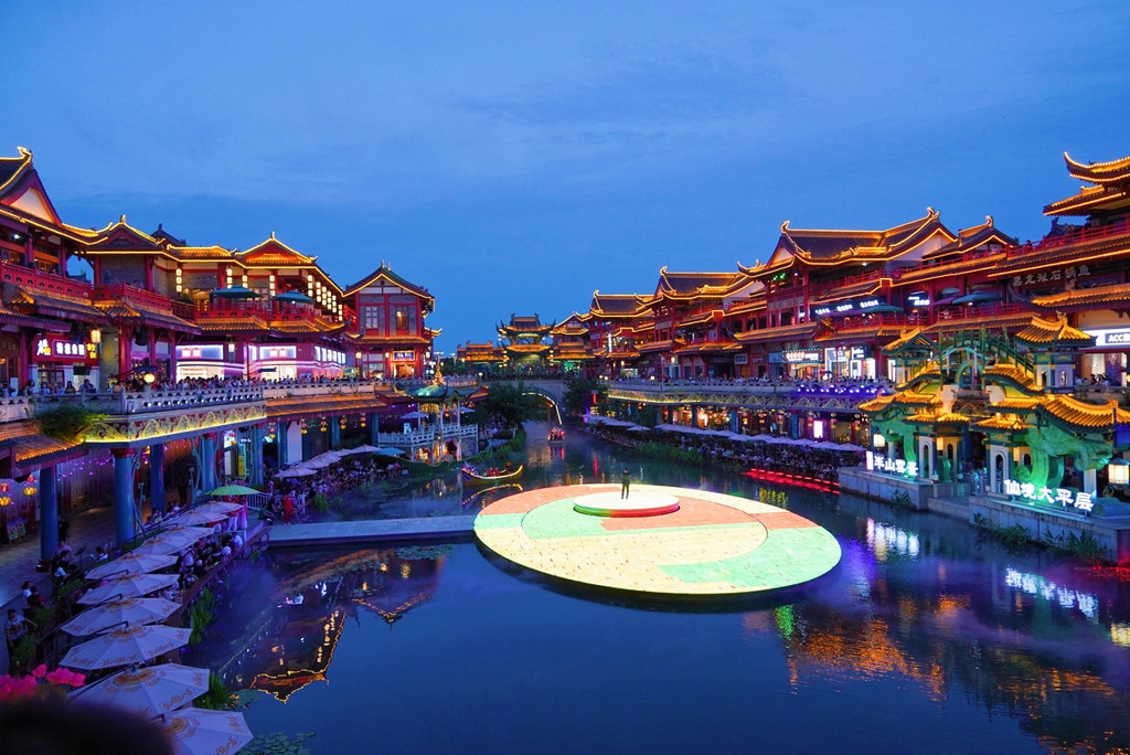 眉山穿越盛世水街是一条云集了美食、灯光秀、演艺为一体的古街,它在线了那个富足的宋代,当时百姓们也有夜生活,听曲看舞,吟诗作画......堪称眉山版《清明上河图》。