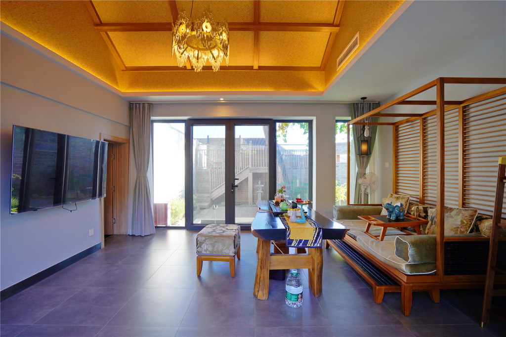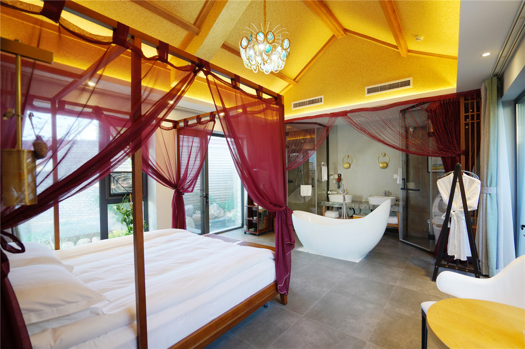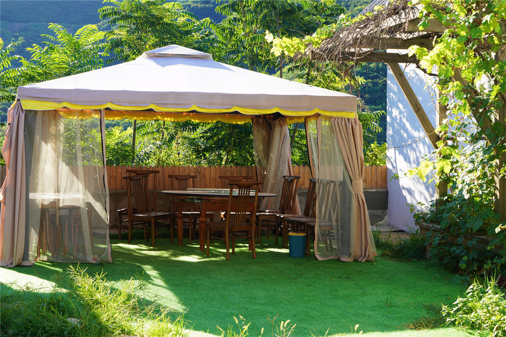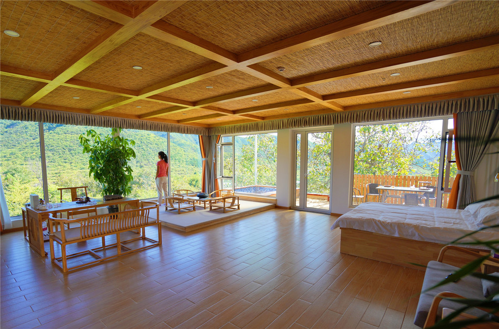 每间房都可以观景,有露天观景台,室外泡池,茶座。蓬莱阁是个聚会开趴体的小独院,里面有帐篷。
