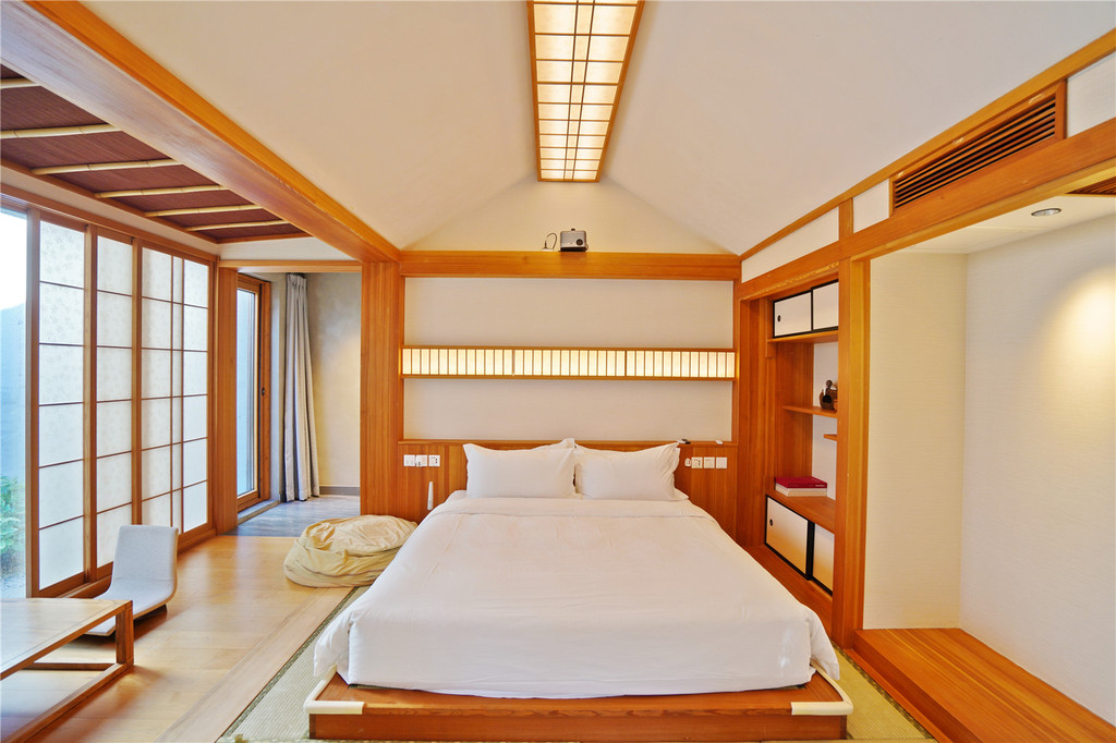 两面落地观景窗,躺在床上就能看到外面蜿蜒起伏的山峦,放眼望去定都阁也尽收眼底。