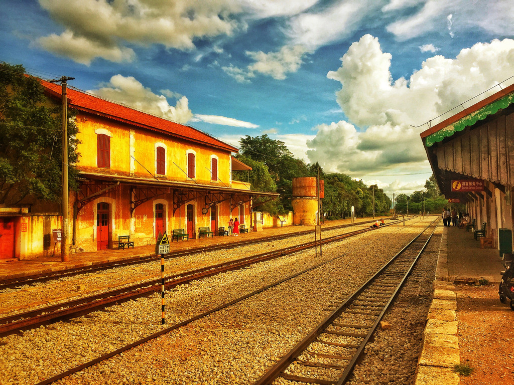 告别老高,出临安,入红河州府蒙自,寻一段曲延的山路,转过山弯便见那黄墙青瓦的站房映入眼帘,百年的米轨静静的横卧在这里向着远方伸展开去;这便是百年滇越铁路的特等站碧色寨,碧色寨因滇越铁路而繁华,也因滇越铁路从一个只有几户人家的村寨变成了一个拥有商贸、海关等功能的繁华车站,更因电影《芳华》而被更多的旅人知悉。岁月不至惊艳了她的时光,也给她留下了弥经岁月洗礼后的芳华,伴着蒸汽机车的咿呀;伴着时光的慢摇就这样沉淀了岁月、洗净了铅华,留下了红土地上别样的风情。