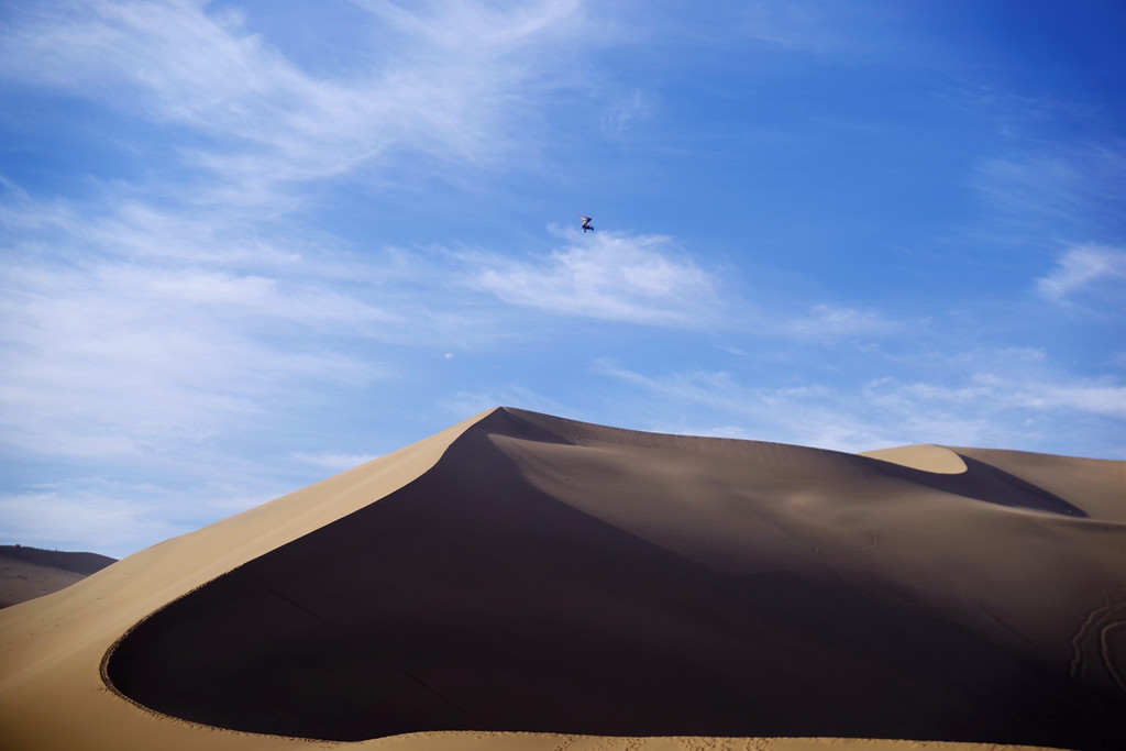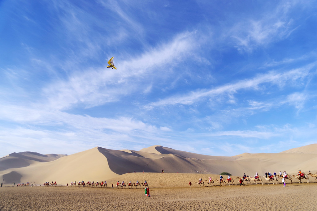 1、月牙泉不允许无人机,所以只有爬上鸣沙山去看月牙泉全貌。现场我问了,那种动力滑翔机是480一人但是不允许带手机、相机等设备上去,只能高考感受一下,而直升飞机是500一人,一架飞机坐四人是可以随便拍照的;
