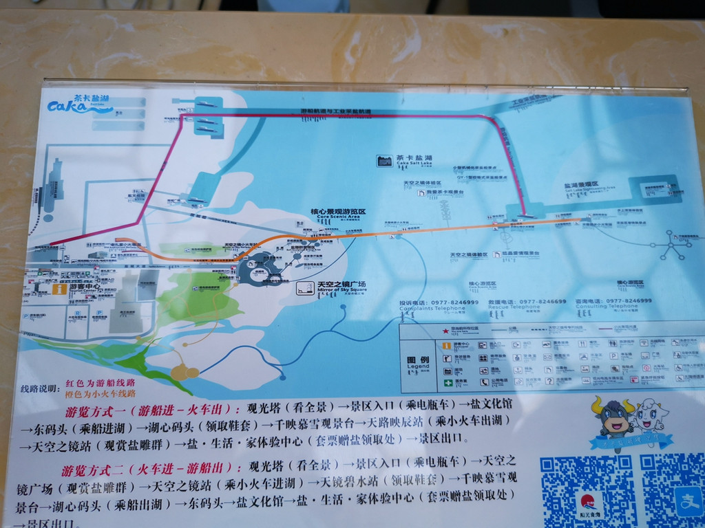 之前做了一点功课,知道茶卡盐湖现在有天空之境和天空壹号两个景区,我们快到茶卡盐湖的时候,在高速路上看到了左侧有天空壹号的景区标志牌,但是我们的导航路线却越开越远,直到17:20我们到达了导航目的地,正好我们面前有一个天空壹号的广告牌我打了景区电话才知道,不论去哪里,都只能到游客中心,再做观光车进景区。所以,如果你看到路上天空壹号的景区指示牌,那个位置的确是景区,但是进不了景区(这一点我保留意见,后面有提示天空壹号旁边的酒店,如果住在天空壹号应该是可以从那里开进去的)。