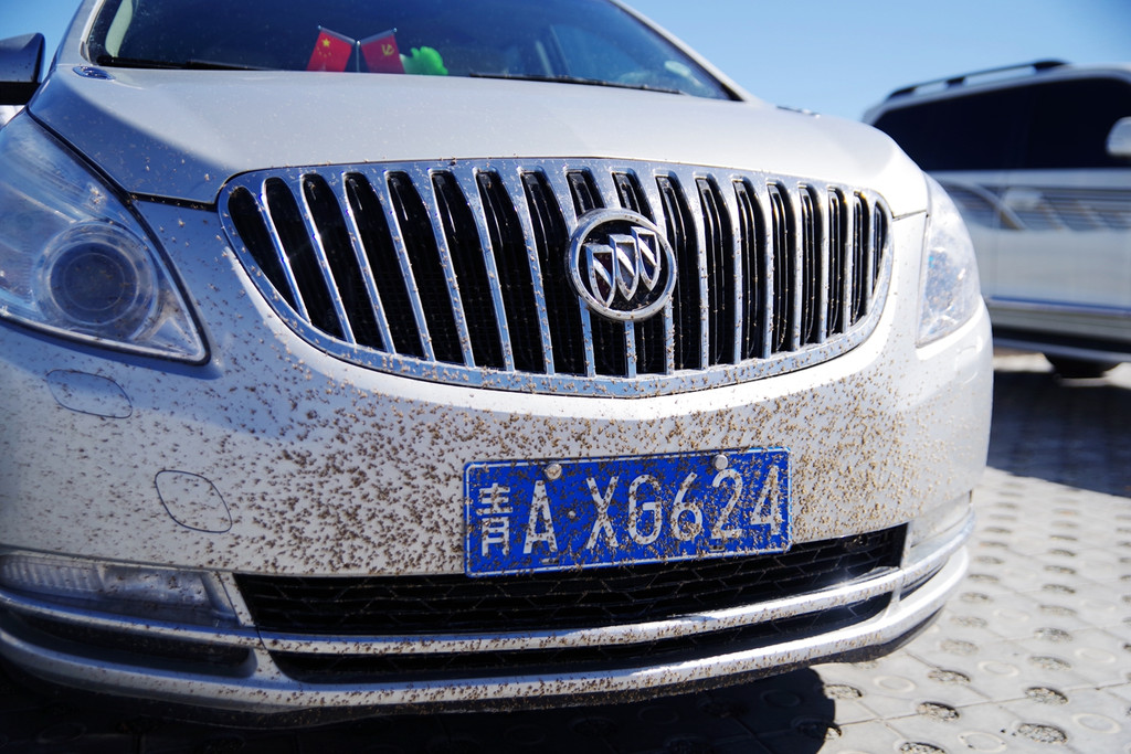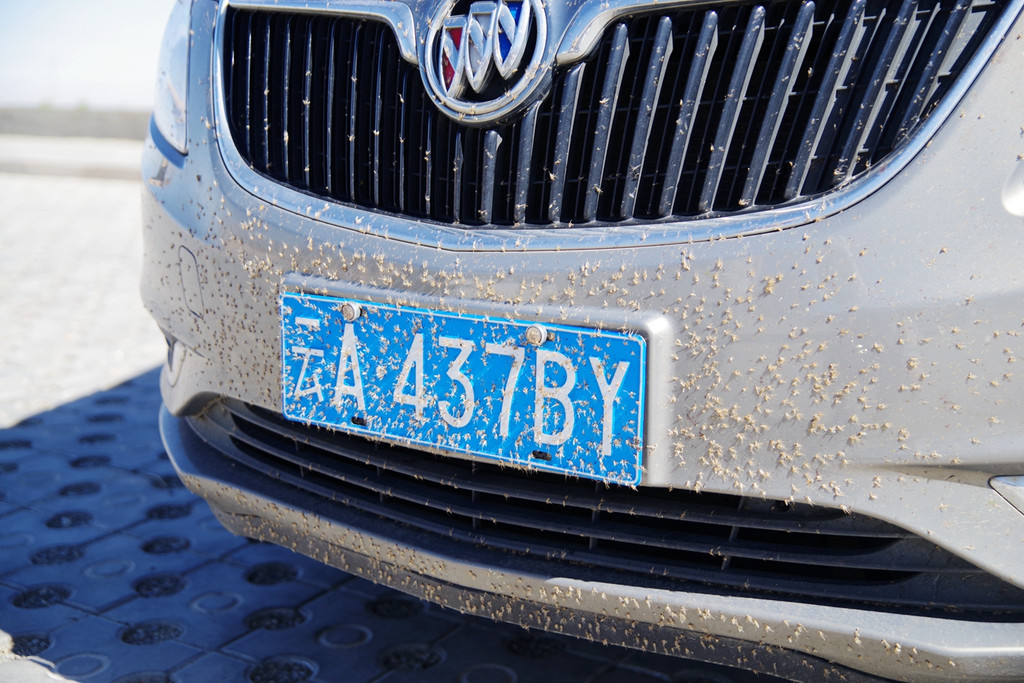 我们停车休息,上卫生间,结果这个休息站卫生间有人收费,最重要的是下车之后我们惊呆了,铺天盖地的蚊子,车门只要打开一点,车里就全是蚊子。等我们开到了 阿克塞 下车一看,只要在那里经过的车子,车头都是这样的!太夸张了!