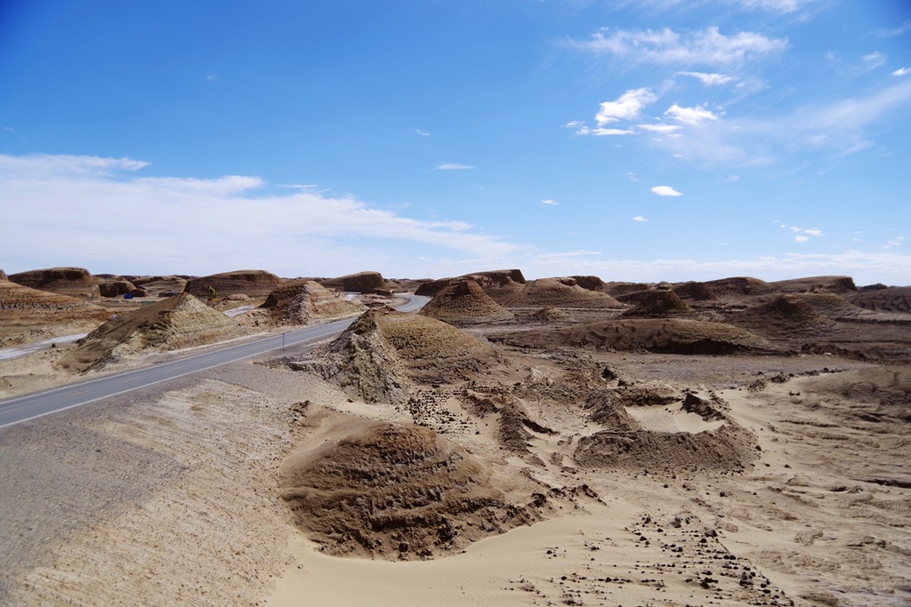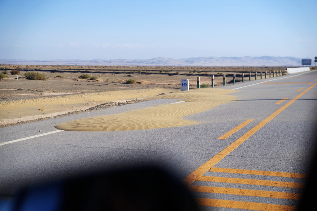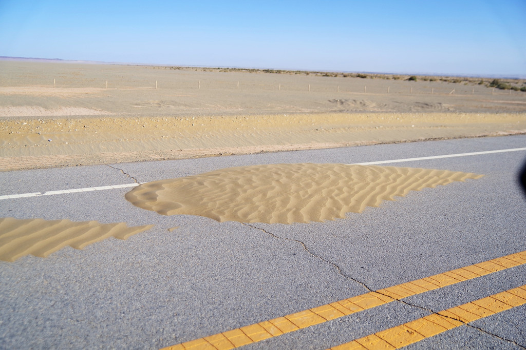 在整个公路两边经常可以看到小型“龙卷风”在飞舞,去 玉门 关的公路更能看到被卷到公路上一堆堆黄沙。