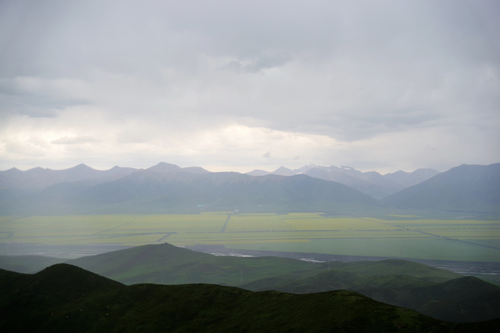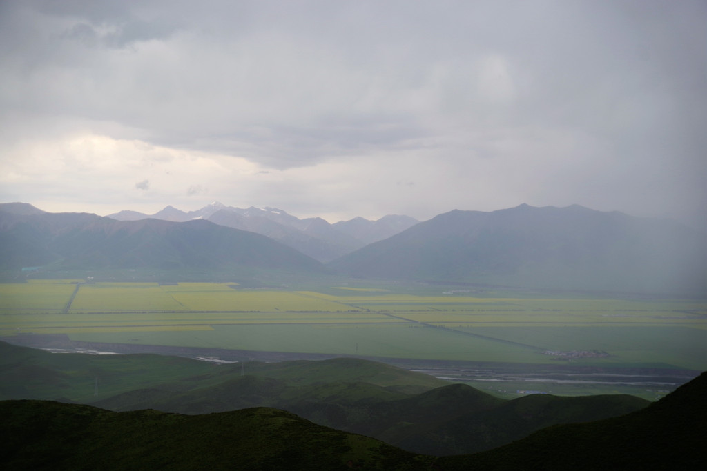 在回去的山路上还有个观景平台,视野更好,可以尽览整个油菜花田和背后的岗什卡雪山,你们看看我现场拍的照片就知道当时的天气。