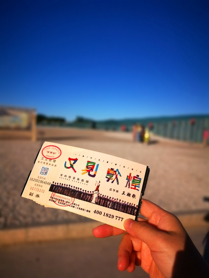 我原计划以为莫高窟要耽误很久,而且携程订票的时候客服专门给我电话确认了订票信息特别是确定《又见 敦煌 》演出的时间,我一直误以为这是一体的。最后现场自助取票只有莫高窟门票,没有任何演出的信息,我才打电话咨询了携程,被告知这是完全无关的两个单位,演出的票是在演出前自己去剧院取的。同时,买套票的时候显示有什么免费接送车,打电话才知道只是从某个酒店接送而已。后来就接到了导游的短信告知晚上找他现场取票。我们游览完莫高窟回到停车场也就下午18点,所以直接开车去酒店办理入住,再稍微休整一下,19点20再出去去演出剧院,也在 敦煌 数字展示中心的隔壁,找到导游取票看演出。