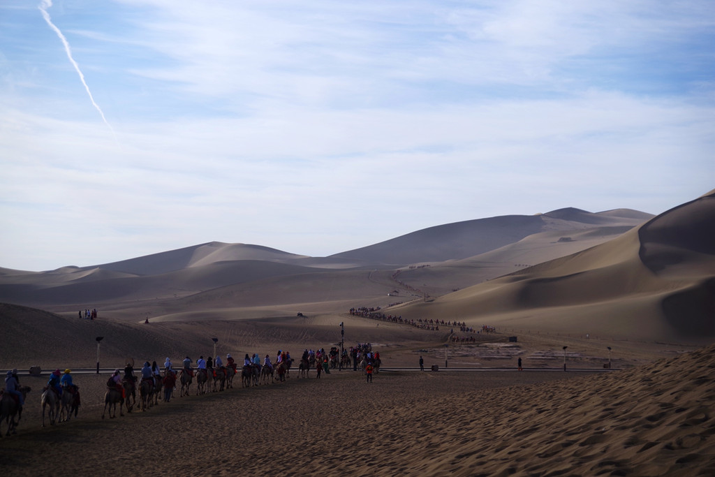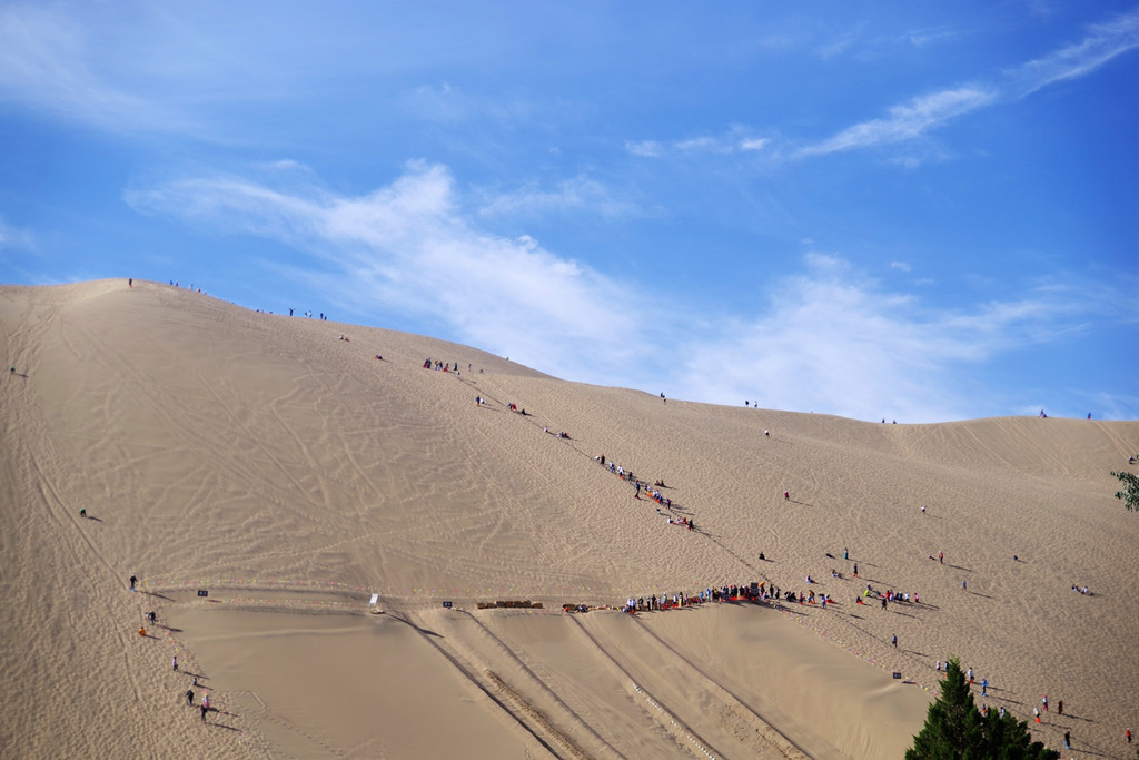 鸣沙山月牙泉改到了在 敦煌 的第三天,因为害怕太热,我们早上8点出发,酒店到景区只要10分钟,然而即使如此,整个景区也已经是人山人海了!其实那一刻我们的兴致已经减了大半。