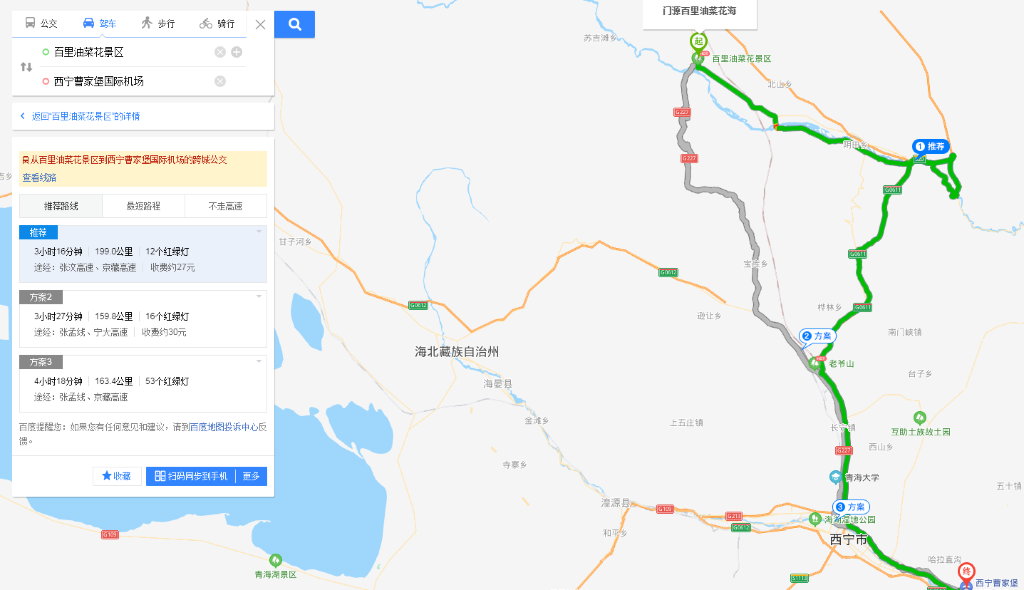 后面的行程很“揪心”,从 门源 出发的时候显示的到 西宁 是没有全高速的,最关键两条可选路线都要经过很长一段省道之类的,看似100多公里都要看3个多小时!