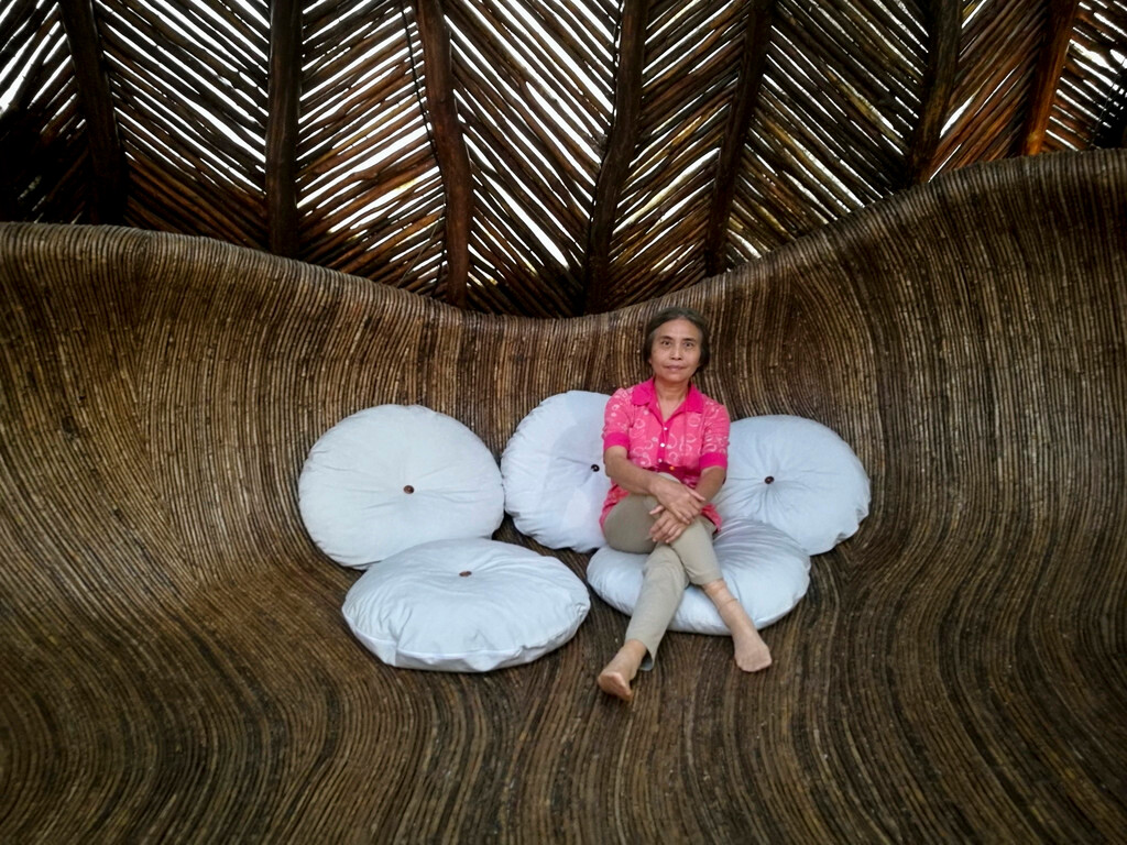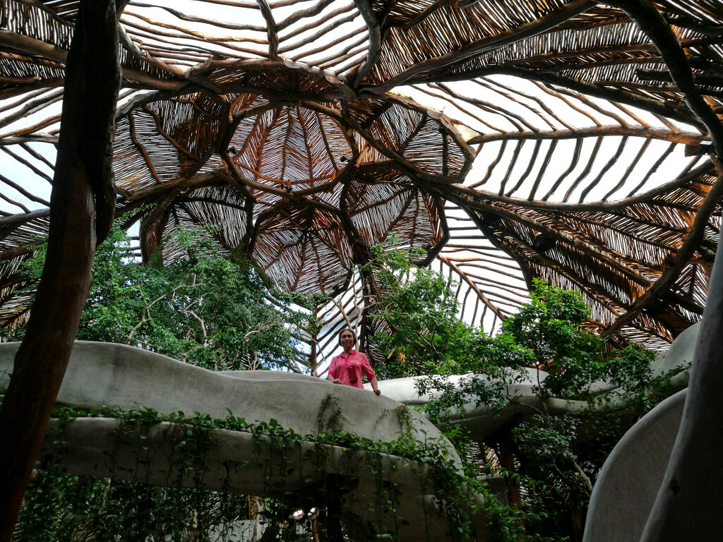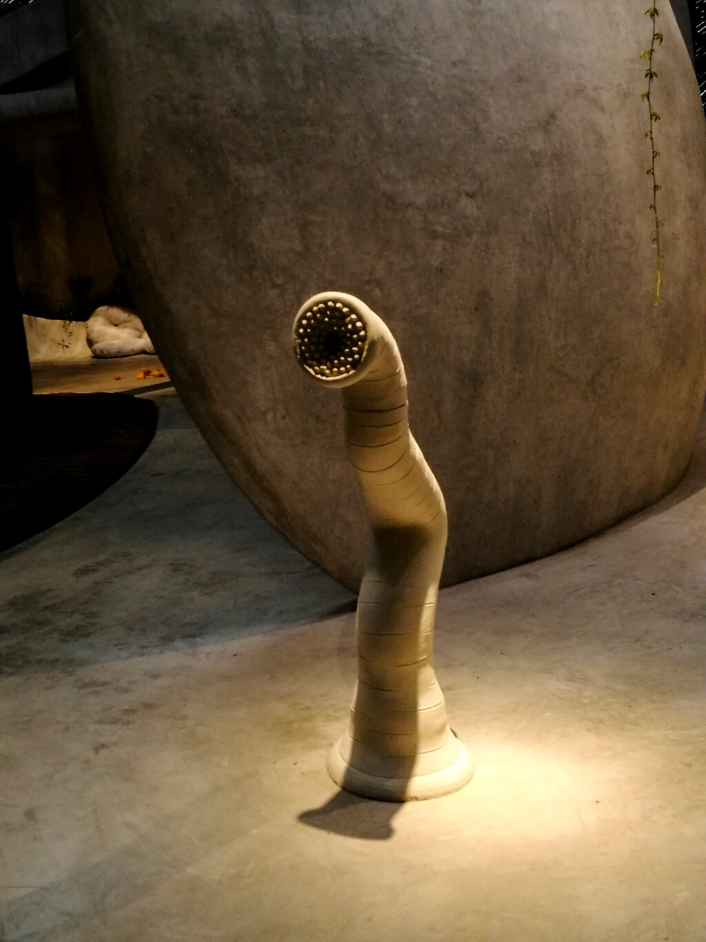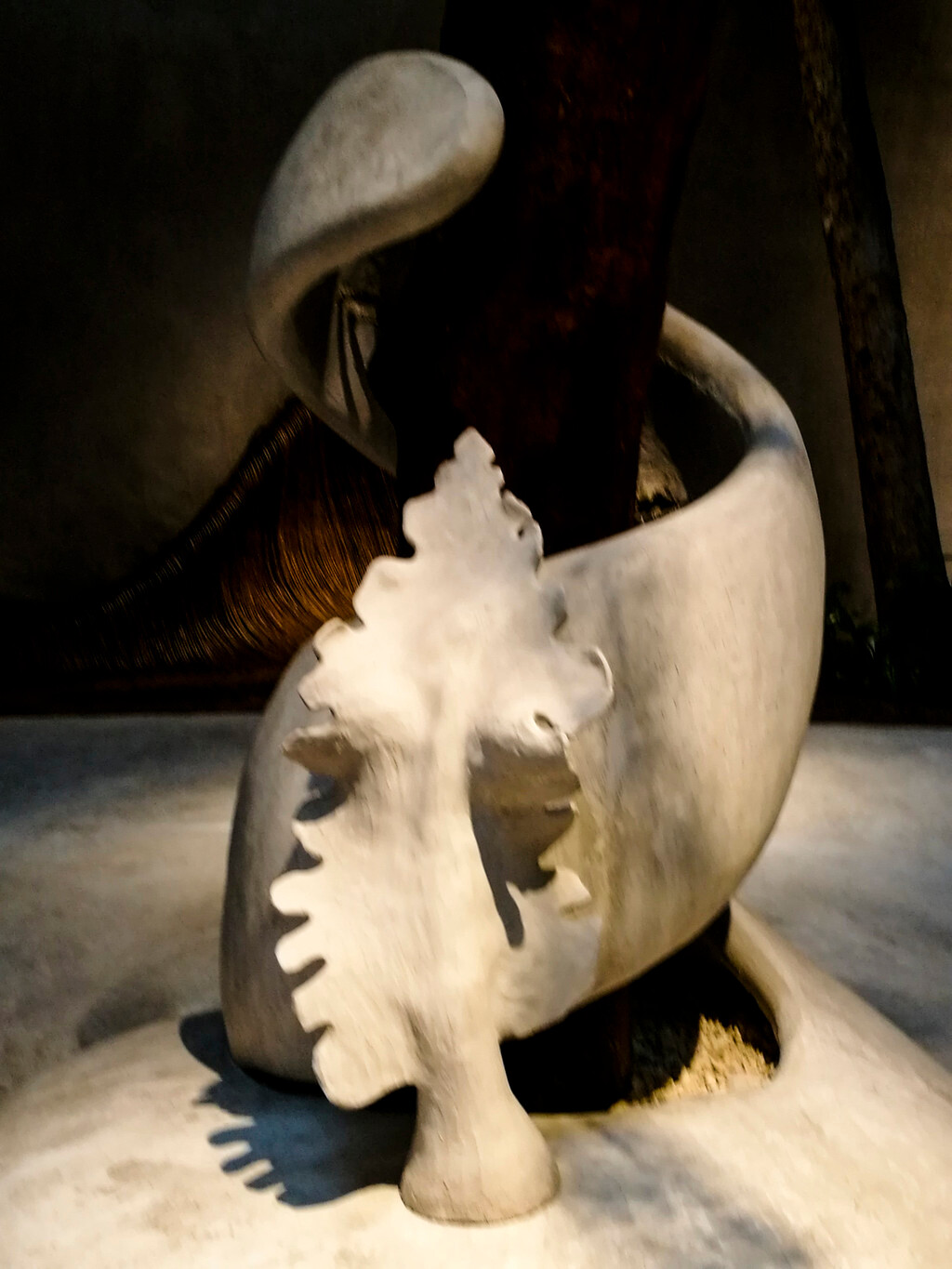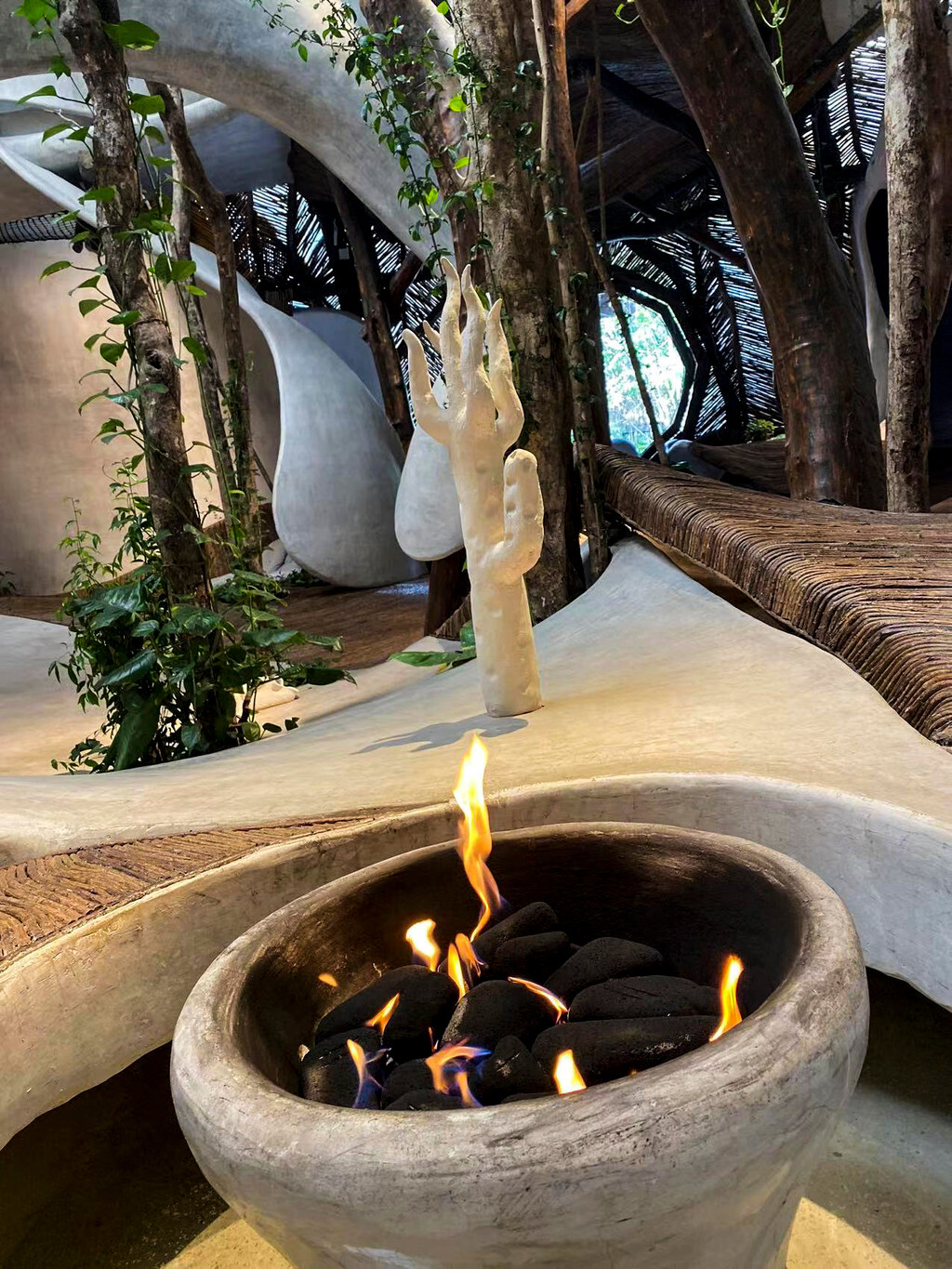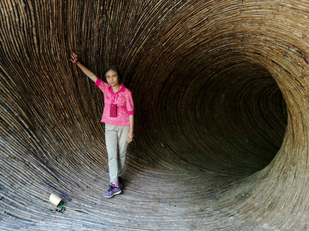 艺术展处在路旁的丛林中,门前烧有几堆火,烟雾缭绕,令人感觉颇有几分神秘。进入里面,只见藤编的过道、廊桥、窗棂等高低错落有致,别具一格;所示展品,形态各异,到底寓意着什么,因时间关系,我们也不得而知。总而言之,展览极具特色,有点意思,很有看头。