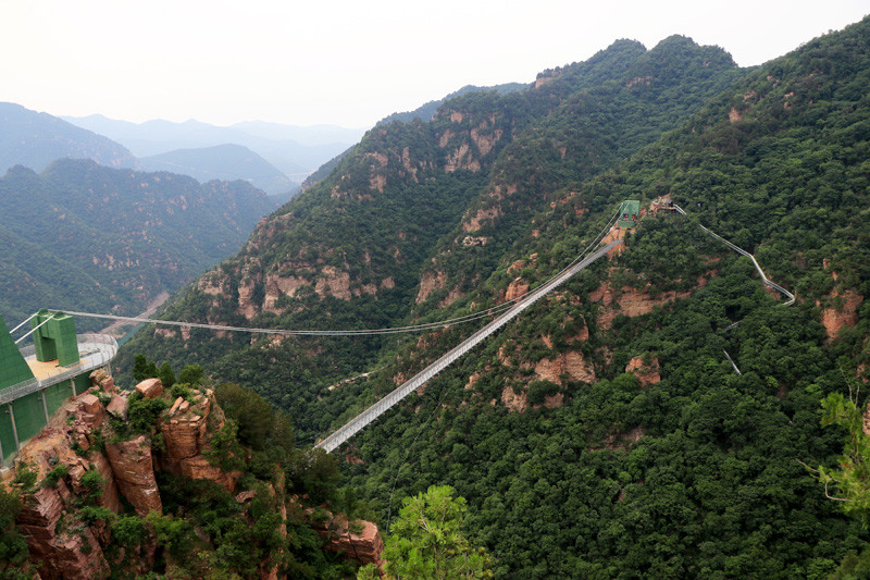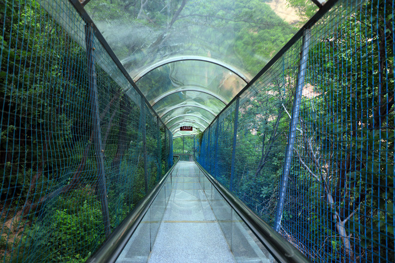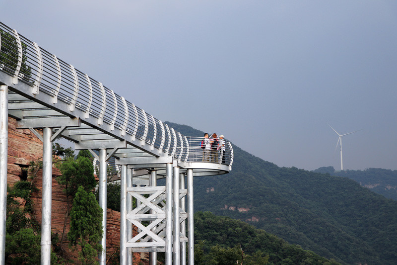 仙鸿桥,横跨仙门山两座山峰之间,长度四百余米,行在玻璃天桥上,有脚踏云端,凌空漫步之感,透过透明的玻璃向下望去,可以看见谷底的景色,还可看到“十里画廊神仙漂”的始发地,以及沿着悬崖峭壁而建的人行栈道。