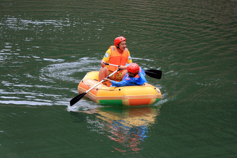 漂流正式开漂之后,只见乘坐皮筏的游客时而在碧波荡漾的平湖中游弋,时而泼水玩水枪,笑声不断。技术不熟练的游客只能在水中团团转,引得岸边的游客笑声一片。