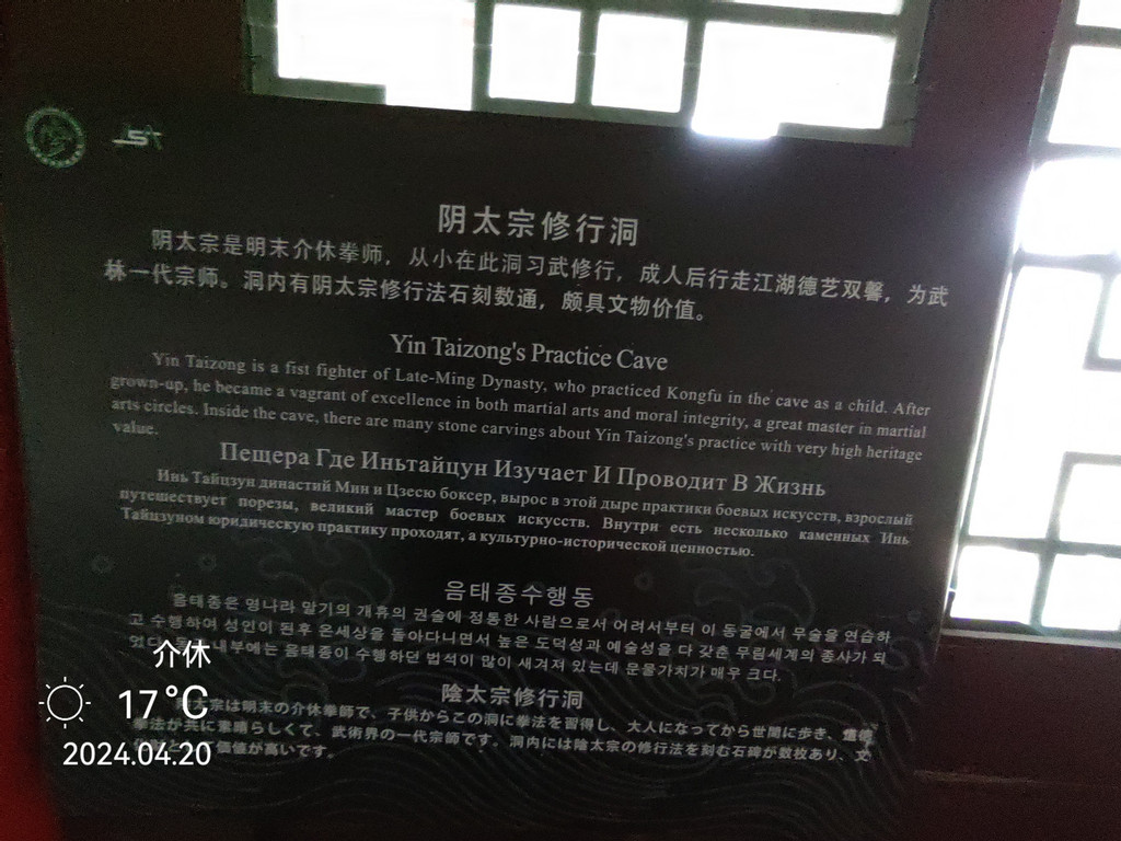 阴泰宗修行洞 阴泰宗,明末清初介休南庄村人。从小从师习武,但长进不大。后有人对他说:“绵山为人间仙境,神佛聚集,何不去求助神灵?”一天,他兴致勃勃上得山来,走着走着却迷失了方向,朦胧中来到了这处洞穴,困意顿生,倒头便睡。朦胧中见一白发老者向他走来,口念咒语。他就觉自己脚下生风,咒语刚落便随之落下。惊醒后,他知道是神仙点化自己,于是在洞内苦心修炼,出山后威震武林,成为一代镖师。解放前夕,有歹徒盗墓,他埋在地下三百多年的躯体竟然完好无损!