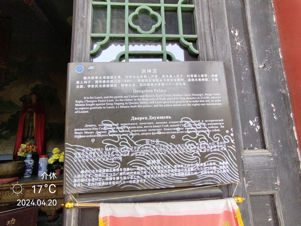 洞神宫是唐武德三年(620),秦王李世民与刘武周在雀鼠谷度索原交兵时曾得洞神宫太清道德天尊护佑而大捷。唐太宗李世民为感神恩,于贞观十六年(642)降诏重修。宋、元、明、清官方和民间先后增葺。1940年遭日军焚毁。1998年三佳公司在原址扩建。