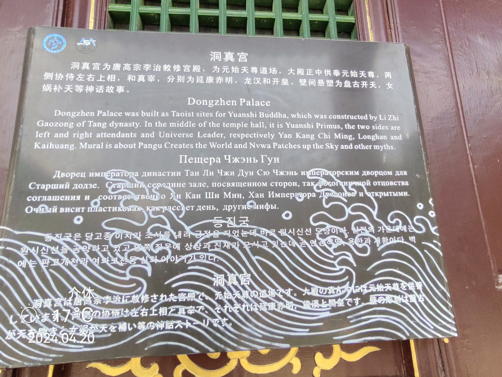洞真宫是玉清元始天尊的道场,主要供奉元始天尊.玉清元始天尊是最高信仰“道”的化身,在三清中地位最高。