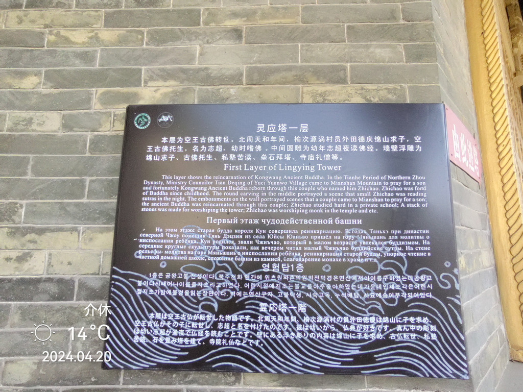 灵应塔又称空王灵应塔、灵验塔,始为唐太宗李世民礼佛谢雨时敕建。为七层四角式砖塔。宋代文彦博重修,按照当时规则,此塔外形由四角方塔变为八角楼阁式宝塔,塔层由七层变为明七暗九层,每层都增加了挑角飞檐,周围有腰檐、走栏、栏杆等附属构件。贞观十五年(641年)春,唐太宗为谢绵山活佛志超赐雨长安,御驾亲往绵山礼佛谢雨,行至抱腹岩下,志超之徒银空迎驾奏道:师父已圆寂西归矣!时天空忽现“空王古佛"四个金字,太宗遂敕封志超为“空王佛”,并敕命建塔一座,以便奉安御赐鎏金“空王宝塔"。时志超弟子银空等请赐塔名,魏征略思奏道;“绵山空王佛有祷必应,庇佑苍生。拟命灵应塔,意为空王佛永佑大唐。”太宗欣喜应允,始有“灵应塔”名,沿用至今。