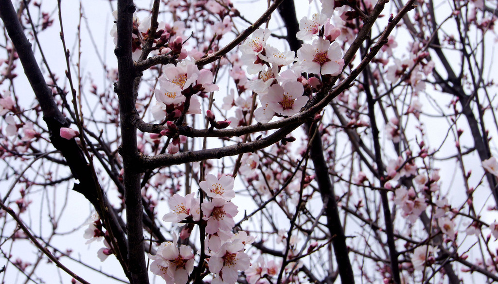 村中的桃树大多都已“上了年纪”,有些更是大树参天,让我俩一再惊叹桃树也能长得如此高大。还有些桃树初看似乎低矮,但再仔细观察就可发现,这些“矮树”的开花枝条虽然都是新枝,但它们所依托的树桩却是粗壮、苍老,显然是逃过砍伐一劫的陈年老树又再获新生。村中还有很多柳树,此刻也正在萌芽,“桃红”搭配“柳绿”,一片春意盎然的景象。