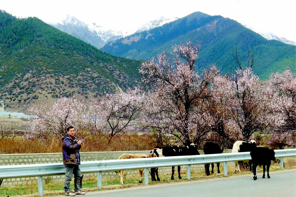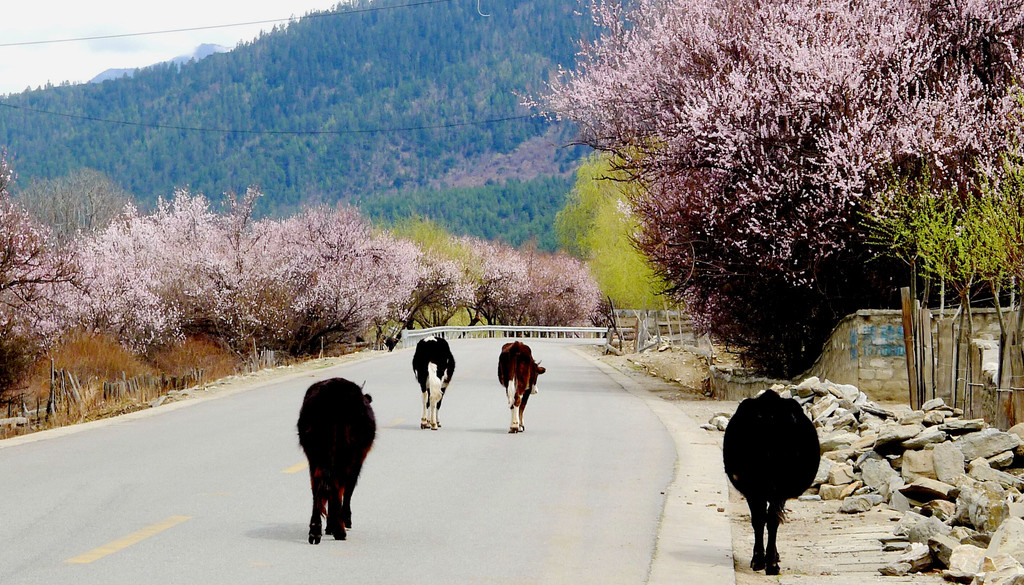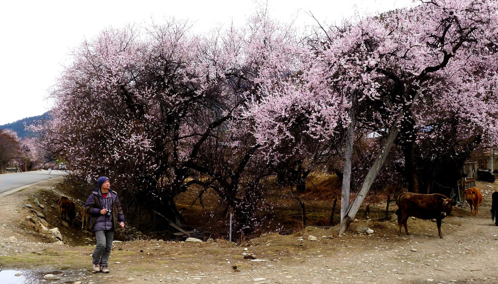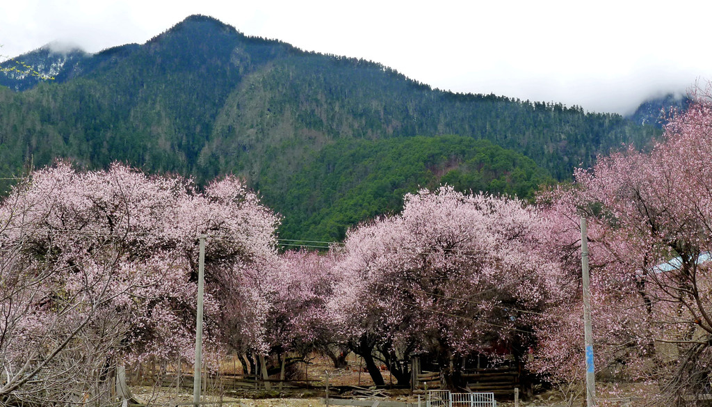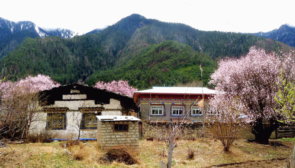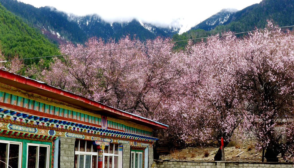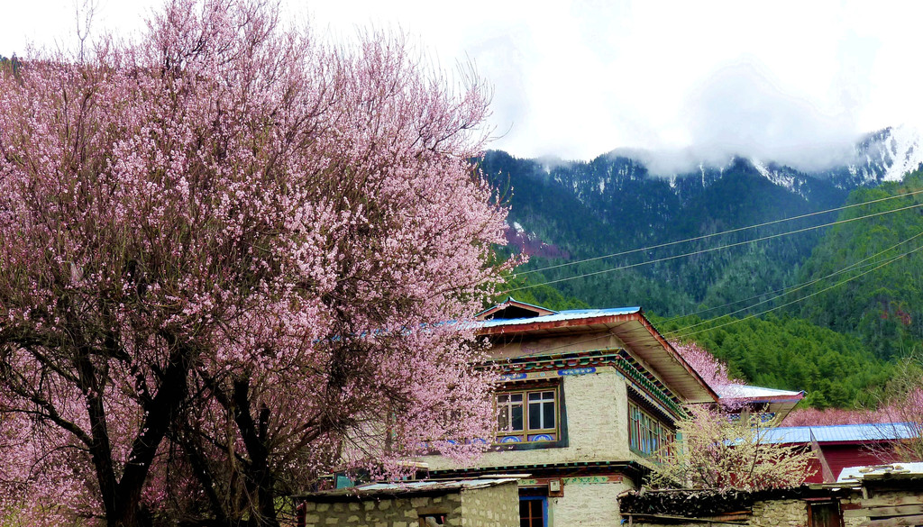时值中午,公路上与村庄内外到处都不见人影,唯有一只被拴住的狗儿孤零零地狂吠,这是一座桃花盛开的小村庄,色彩艳丽的藏式民居散落在一团团、一簇簇的粉色桃花丛中,小村庄的背后是松林与雪峰,眼前所见让我突然想起晋代陶渊明的“桃花源记”。
