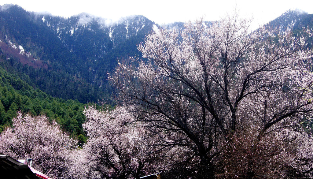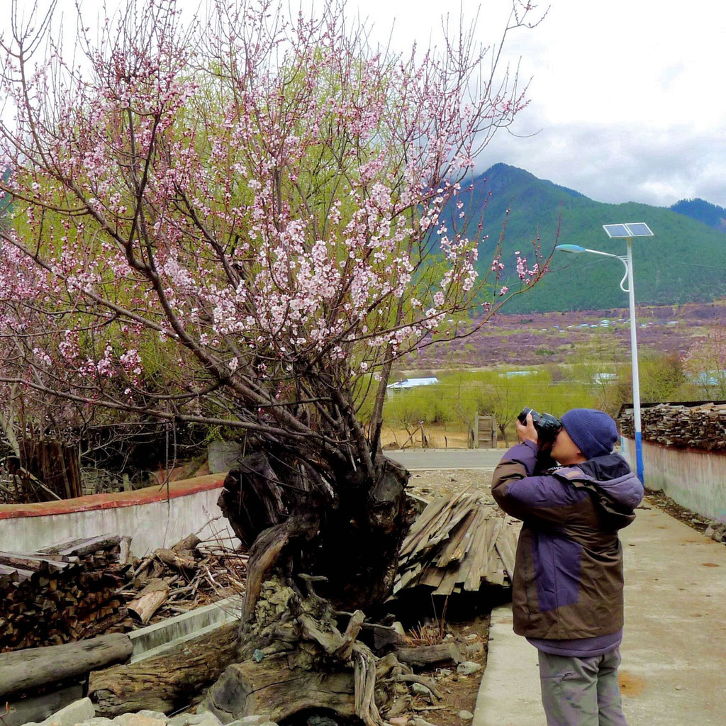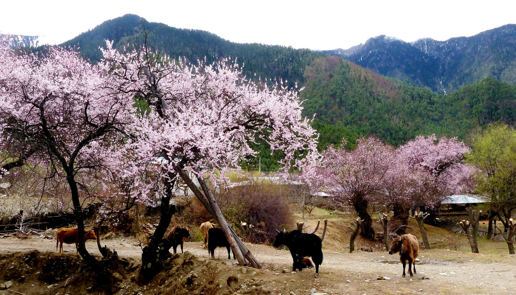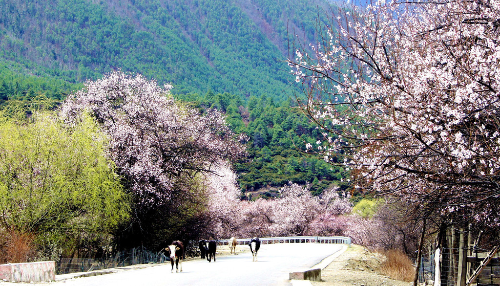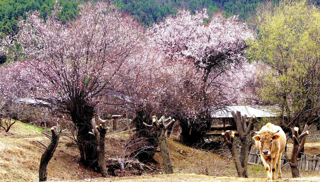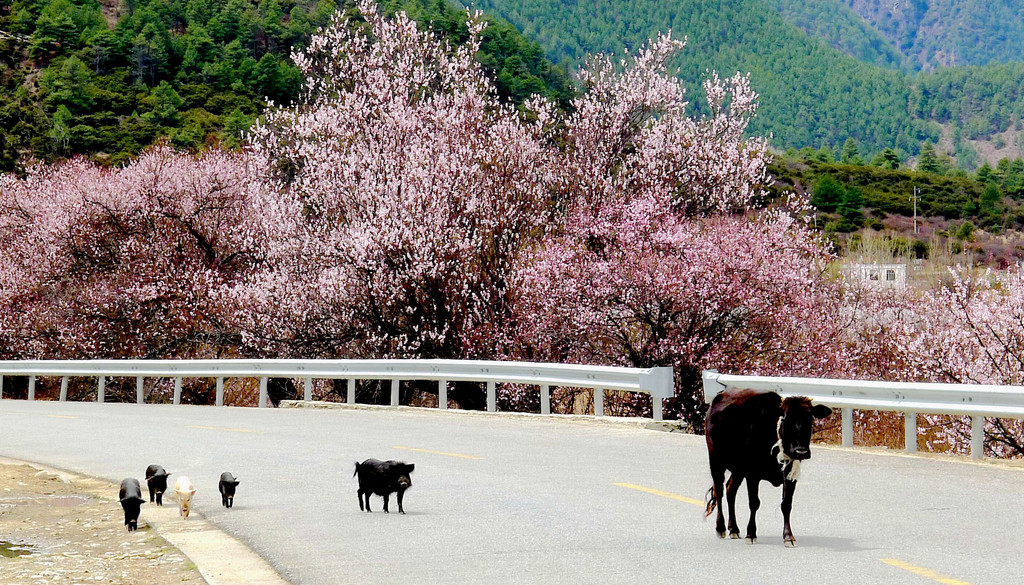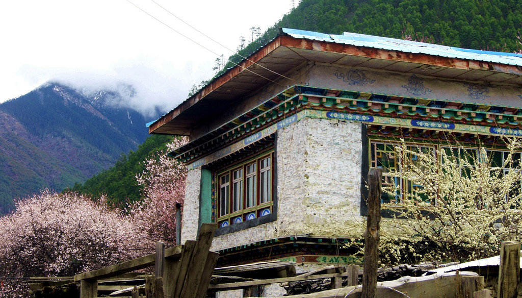 时值中午,公路上与村庄内外到处都不见人影,唯有一只被拴住的狗儿孤零零地狂吠,这是一座桃花盛开的小村庄,色彩艳丽的藏式民居散落在一团团、一簇簇的粉色桃花丛中,小村庄的背后是松林与雪峰,眼前所见让我突然想起晋代陶渊明的“桃花源记”。
