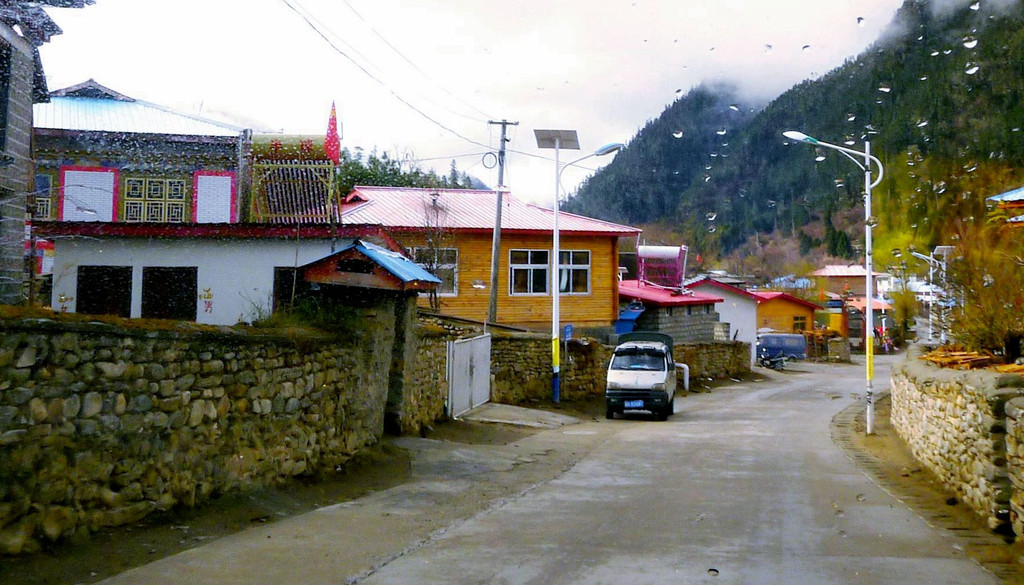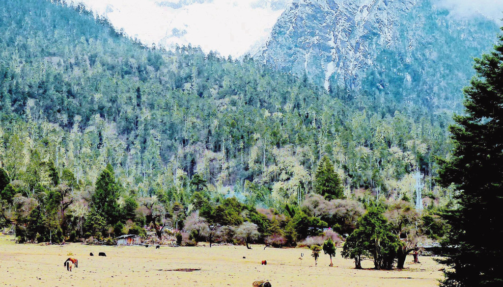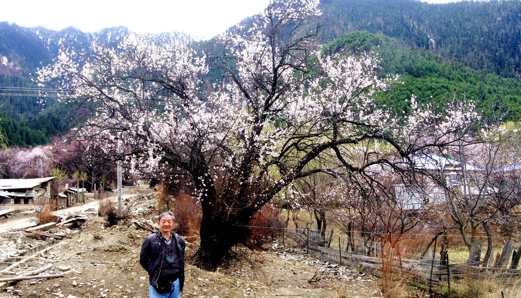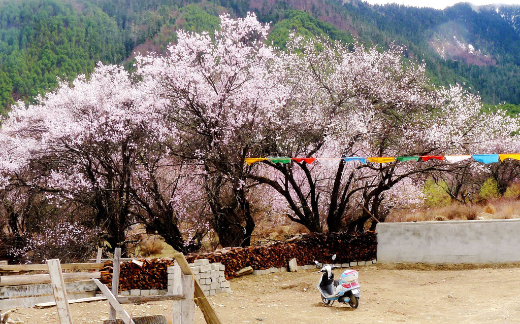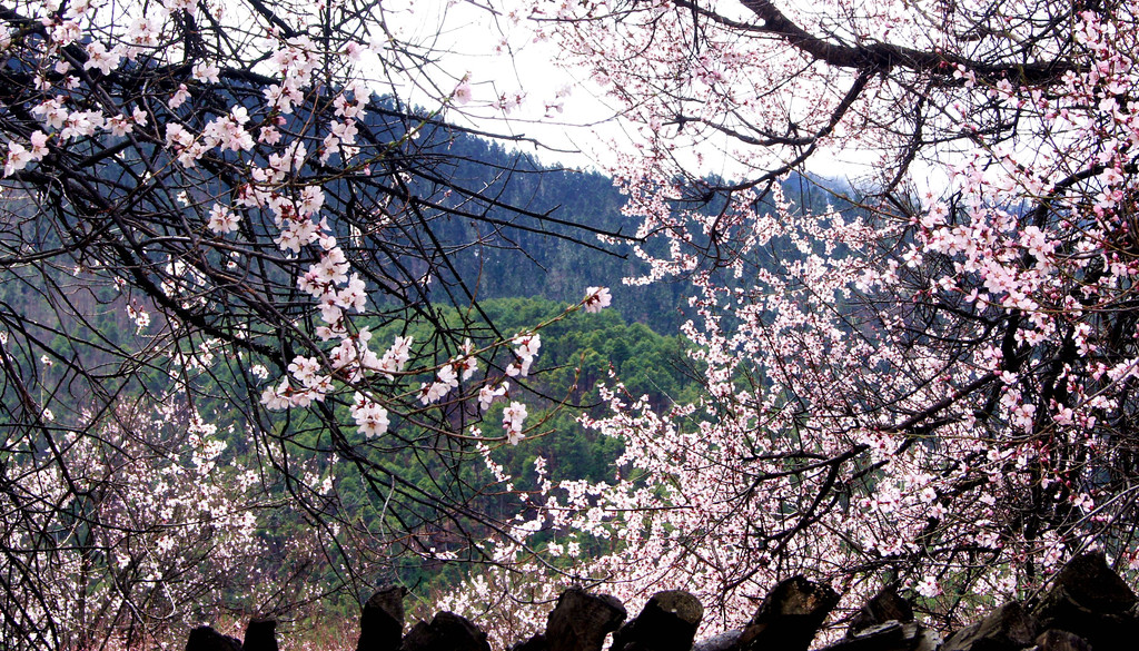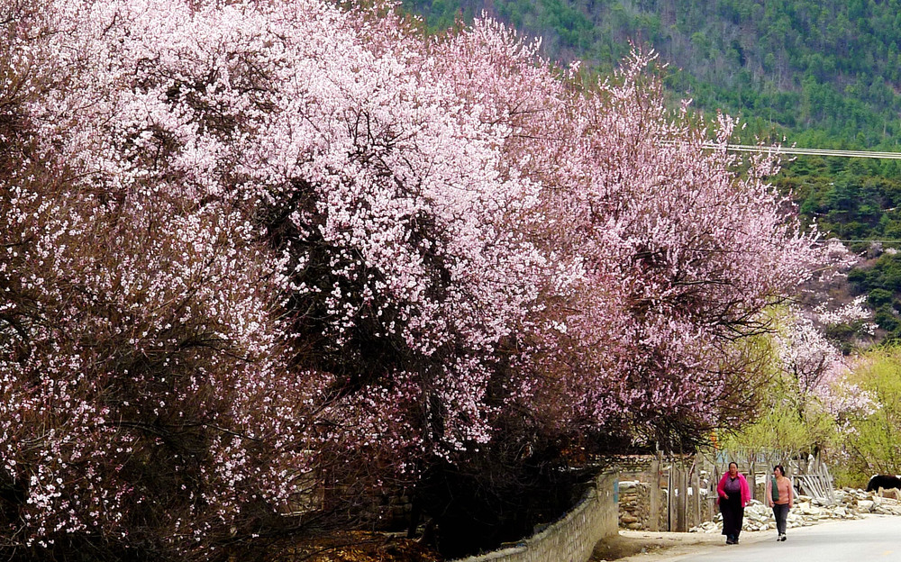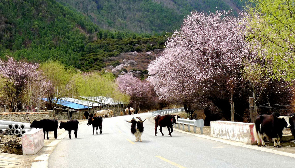时值中午,公路上与村庄内外到处都不见人影,唯有一只被拴住的狗儿孤零零地狂吠,这是一座桃花盛开的小村庄,色彩艳丽的藏式民居散落在一团团、一簇簇的粉色桃花丛中,小村庄的背后是松林与雪峰,眼前所见让我突然想起晋代陶渊明的“桃花源记”。