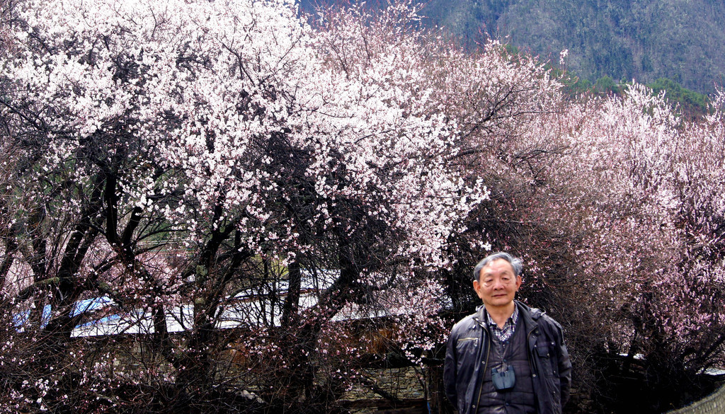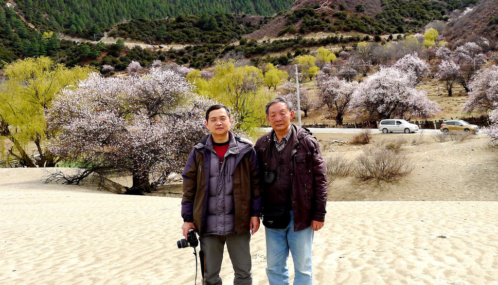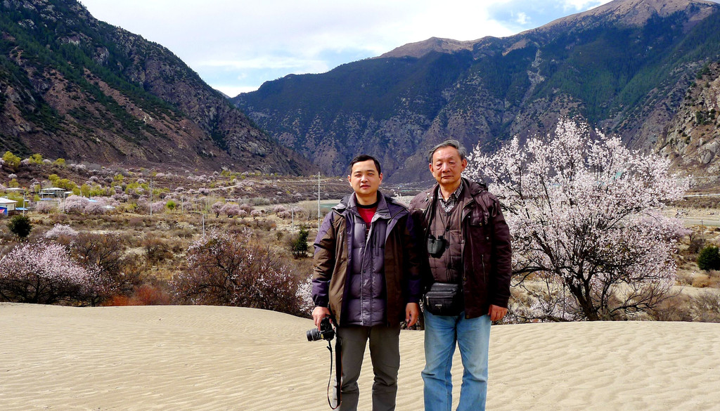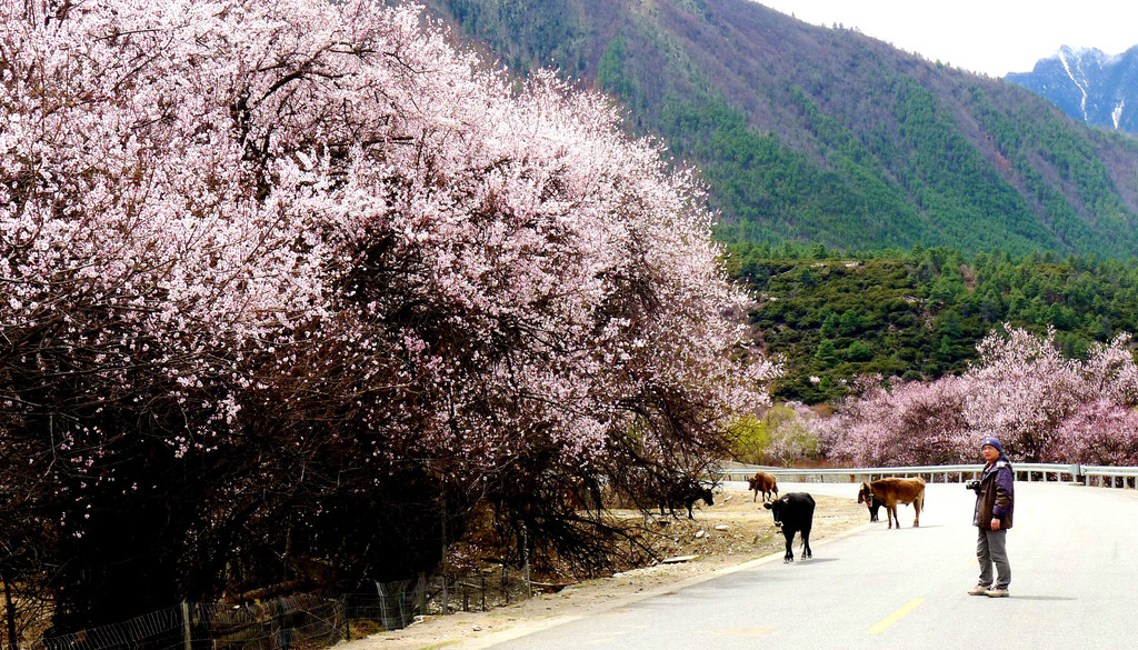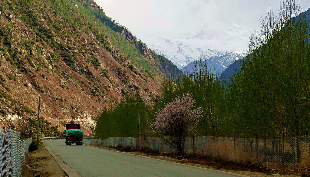 饭后出发,先在武警哨所换回身份证,然后驶出南伊沟,左拐上省道S306,沿着雅鲁藏布江向西行,前往朗县、加查方向。13:41路过一座不知名的村庄,突然发现公路两侧到处都是桃花,我和X.J.赶忙下车,沿公路徒步前行,让邓师傅留在原地等候。
