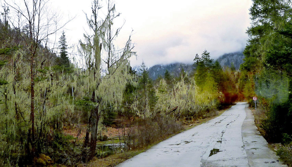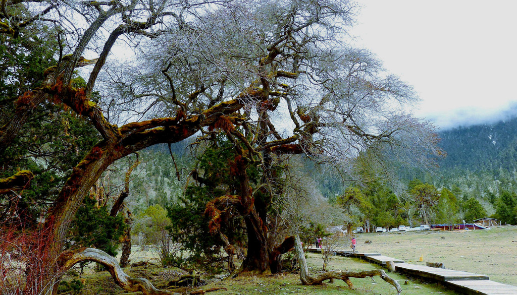 木栈道长约1公里,专为旅游而建,穿越牧场周边进入密林深处。在栈道入口处有售卖珞巴族特色烧烤的摊位,将肉、鱼、土豆串好后放在大块石板上烤熟,石板下面用柴火灶加热。我们买了两个牦牛肉串,边吃边走进入密林深处。高高的大树上悬挂着长长的松萝,有些树干还附生绿茸茸的不知名团块,这里虽属海拔3000米,但却并不匮乏氧气,两人漫步森林氧吧,着实感觉心旷神怡。