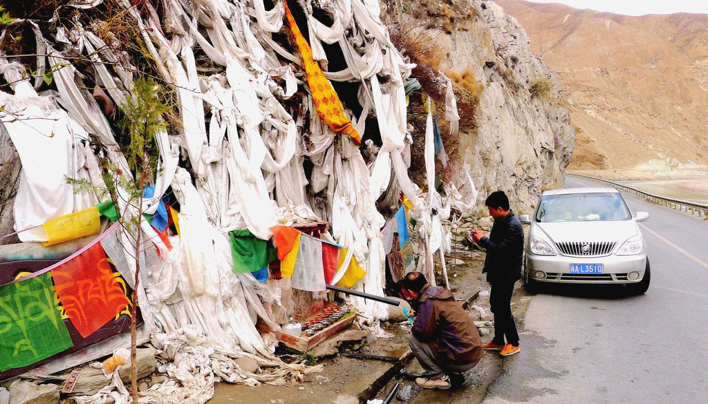 18:29穿越朗县,我们没有停车,出城后过桥,从雅鲁藏布江南岸改为沿着江北行驶。18:35驶经“林拉铁路”大桥工地,一座座桥墩高高耸立,估计铁路通车的日子也已不会太远。18:44邓师傅又在公路边上停车,此处山崖下有一眼“神泉”,据说能保平安、保健康。邓师傅说若是搭载其他客人他一般都不会在这里停车,只因跟我们特别投缘,所以也要让我们保保平安,我俩都尝了几口,还各自接了一瓶,在路上喝光。