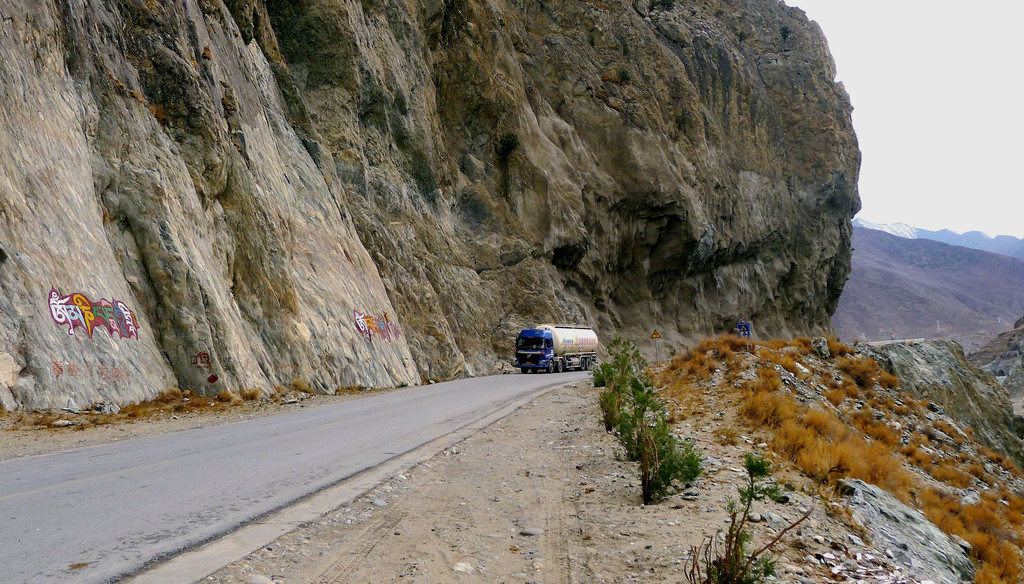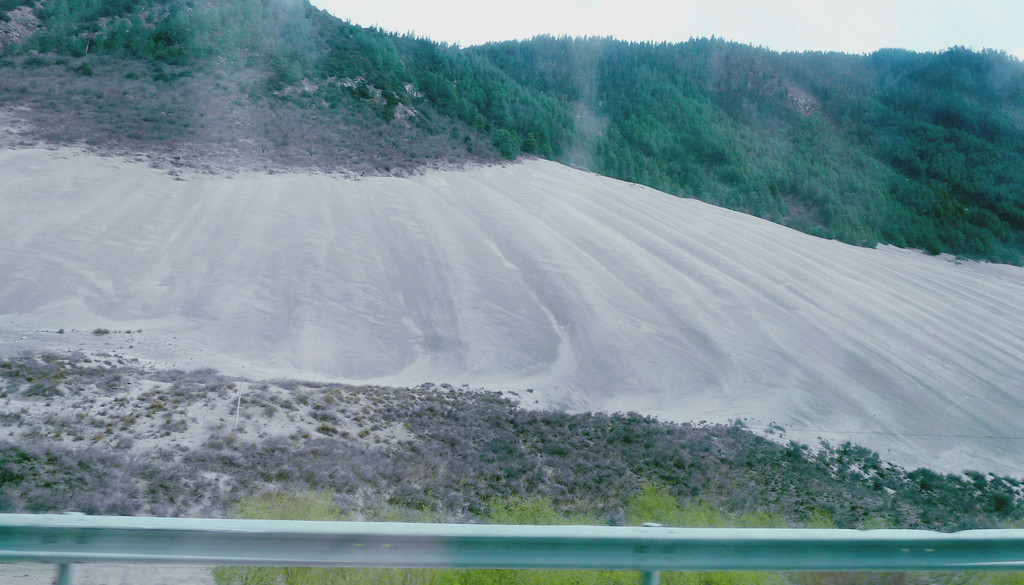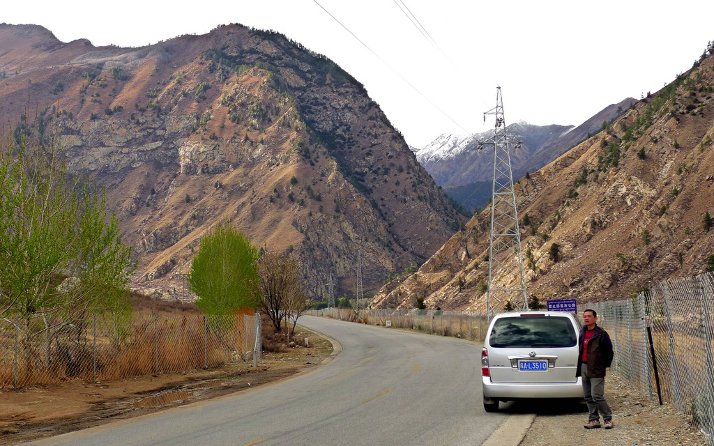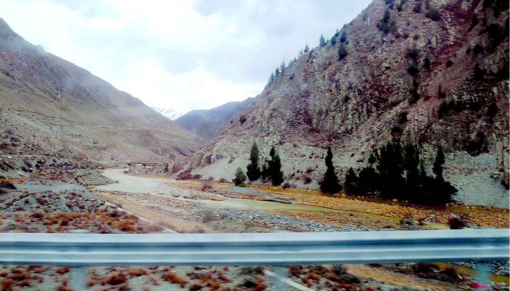 16:58离开巨石滩,再前行不远就算是离开了米林县,进入同属林芝市的“朗县”地界。周边愈发地荒凉,邓师傅扬言山南地区的公路没有区间测速,可以随便开,然而,他却是忽略了我们现时尚未驶出林芝市,17:54在一处公路两侧都有铁丝网(保护道边种植的树木)的山谷中又看到了好似近期刚刚设置的区间测速标志,邓师傅自知已经超速,吓得赶忙停车,再耗时间,我和X.J.也再一次乘机下车,活动一下腿脚。