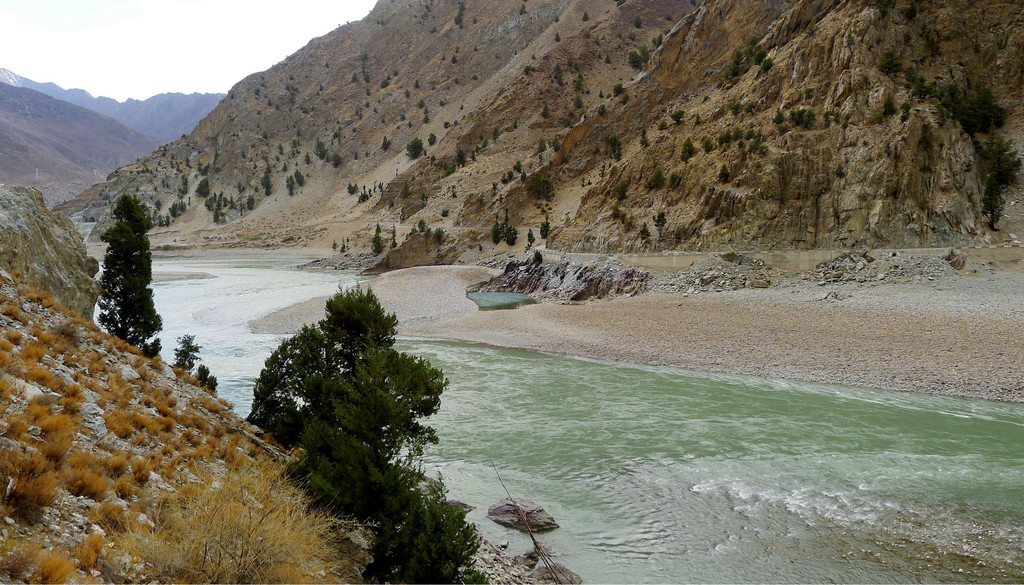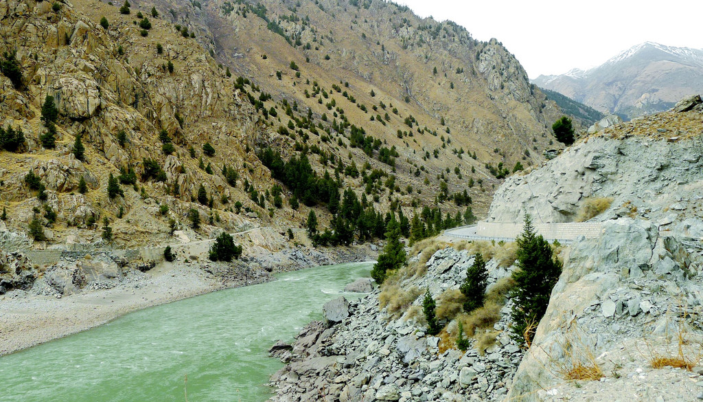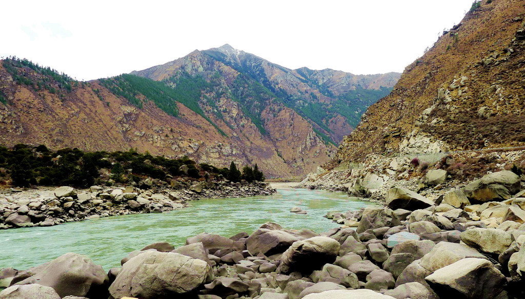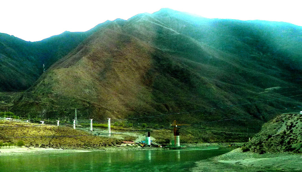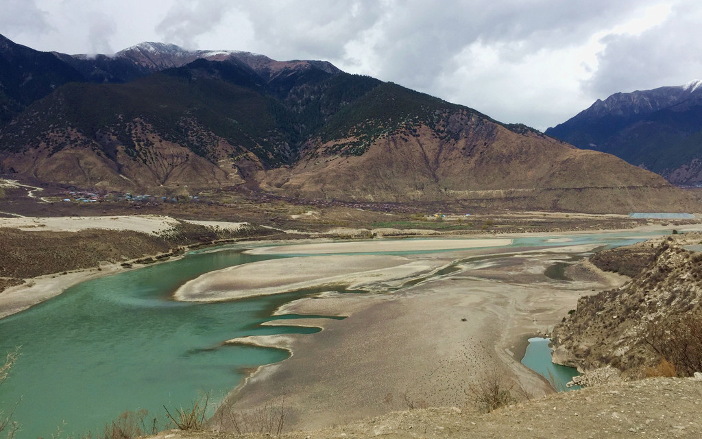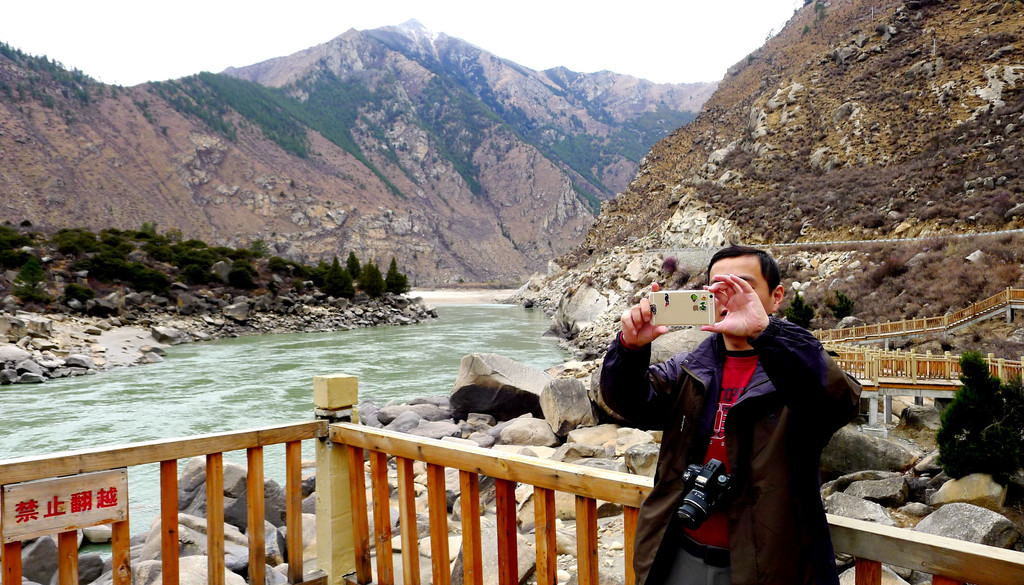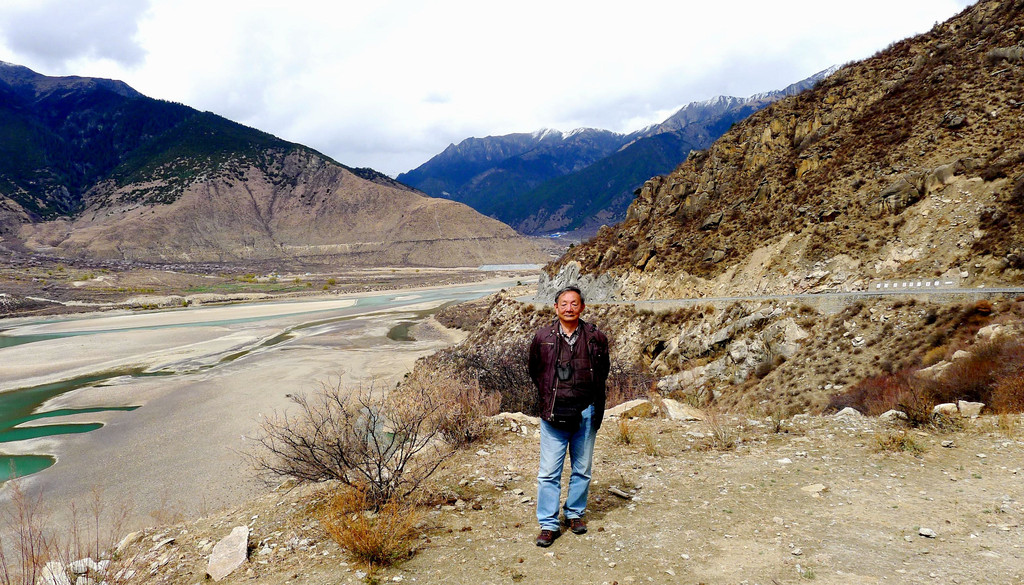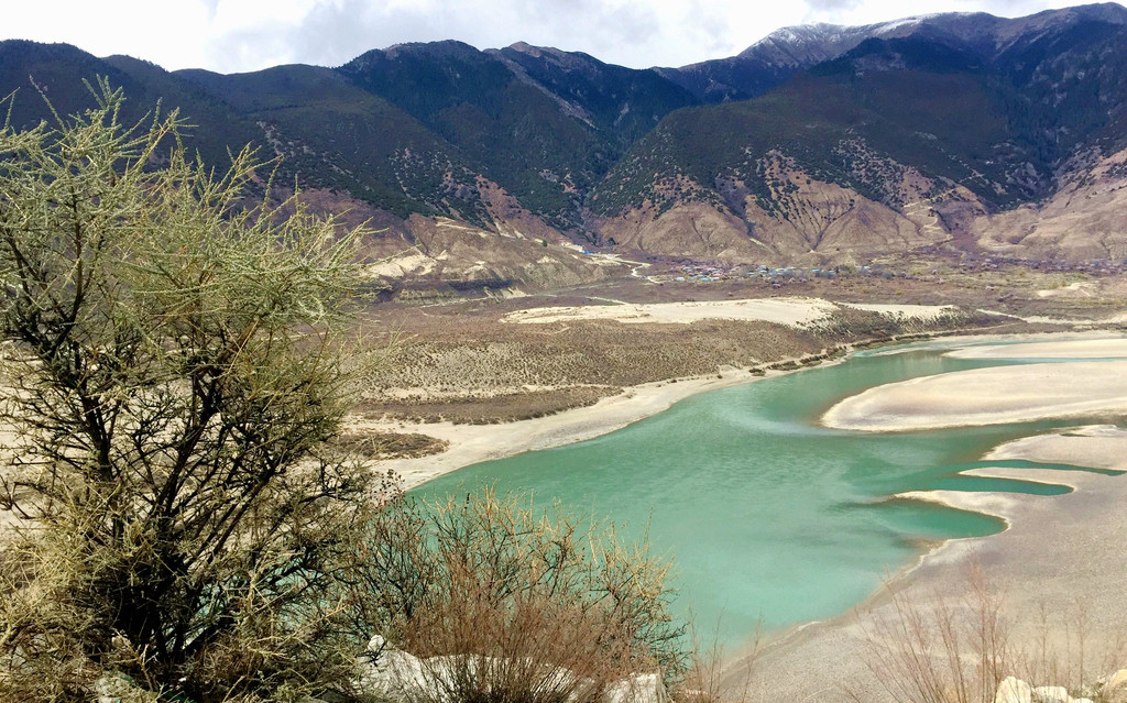 14:30走出桃花小村,打电话让邓师傅开车过来,我们继续赶路。雅鲁藏布江一直是伴随在公路的北侧,我们逆流向西行驶,沿途景观慢慢地起了变化,山上的林木越来越稀疏,干旱与枯黄逐渐成为周边环境的主要色调。西藏的公路都有区间测速,如若超速,司机就得受罚,15:36邓师傅察觉车速太快,只好在雅鲁藏布江边的一处高崖上停车,消耗时间。我和X.J.乘机下车观景,拍拍照片。雅鲁藏布江的河道其实是非常宽阔,只不过此刻是属于枯水,河床大部分干涸,裸露出一块、又一块的沙滩,江水也是清澈、碧绿,流动十分平缓。