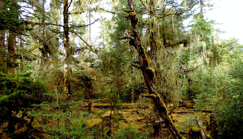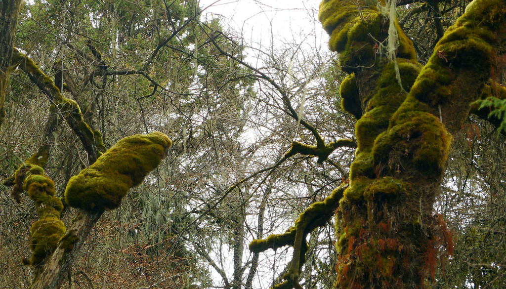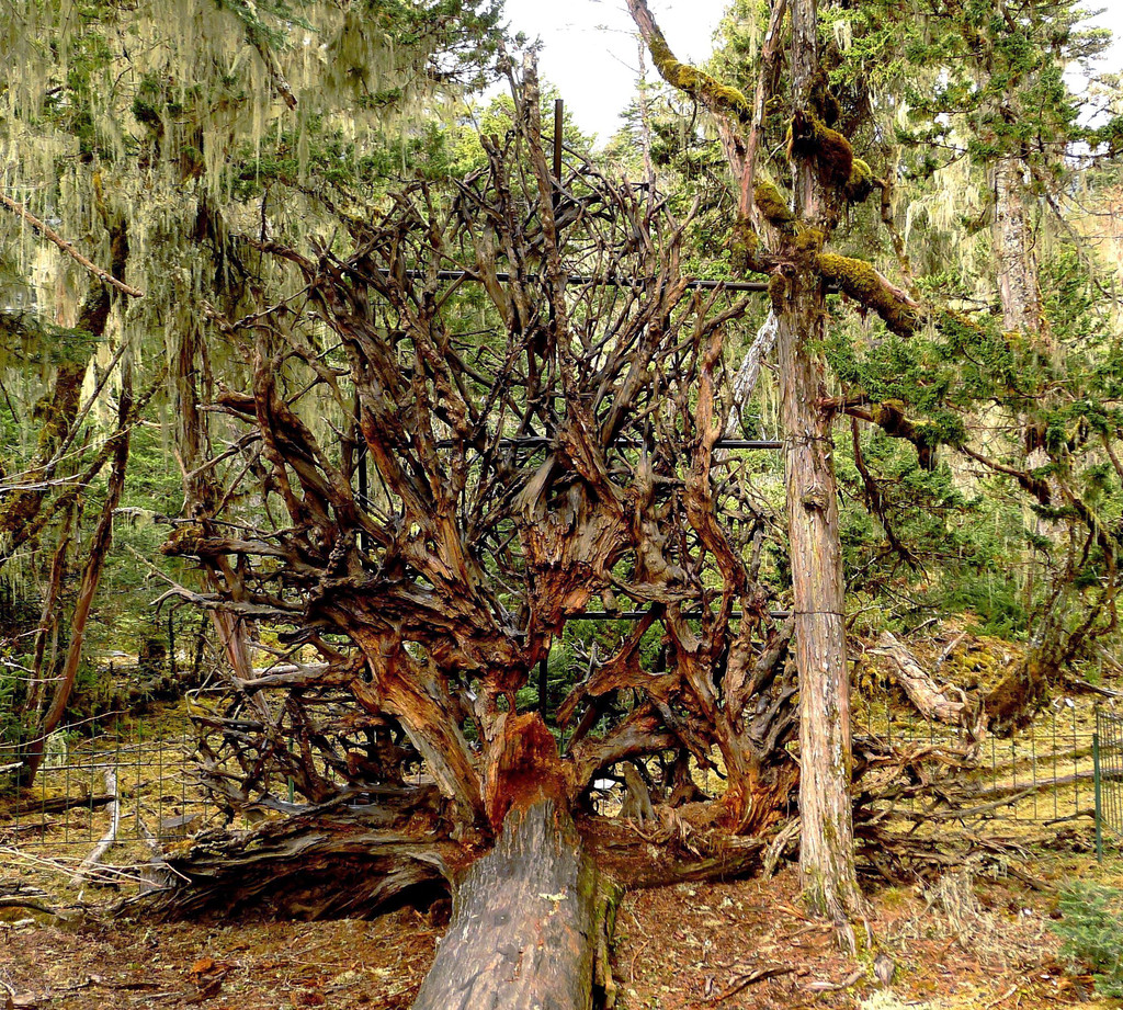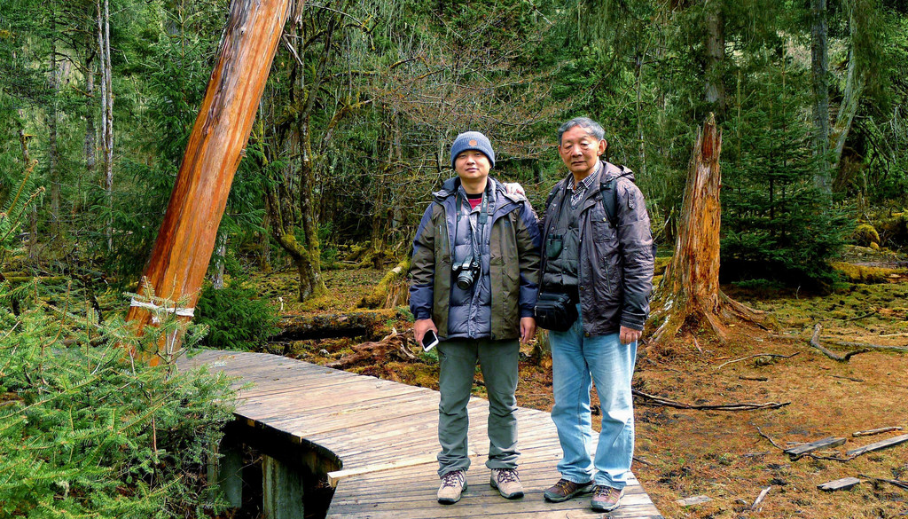 因为拍照,我们与同车的团友渐渐拉开了距离,X.J.担心会超过交通车司机所给的30分钟时限,但我判断应该没问题,因为事先已从网上获知,此地的木栈道观光一般都是给足一个小时,我们的司机故意将时间减半,其实也有“头戴三尺帽不拍砍一刀”的意思。11:44来到一处叫做“阴阳树”的景点,其实就是一棵大树倒掉以后,翘起的树根展开成为一颗树的样子,树根在地下的时候是“阴树”,翘起来就成为“阳树”。附近的其他树木也都造型奇特,有一棵树的顶端枝杈是银灰色,树干却是褐黄,估计也是因为苔藓附着所致。
