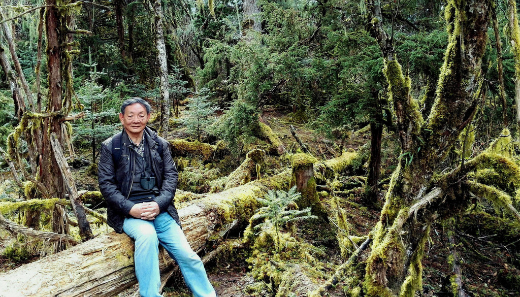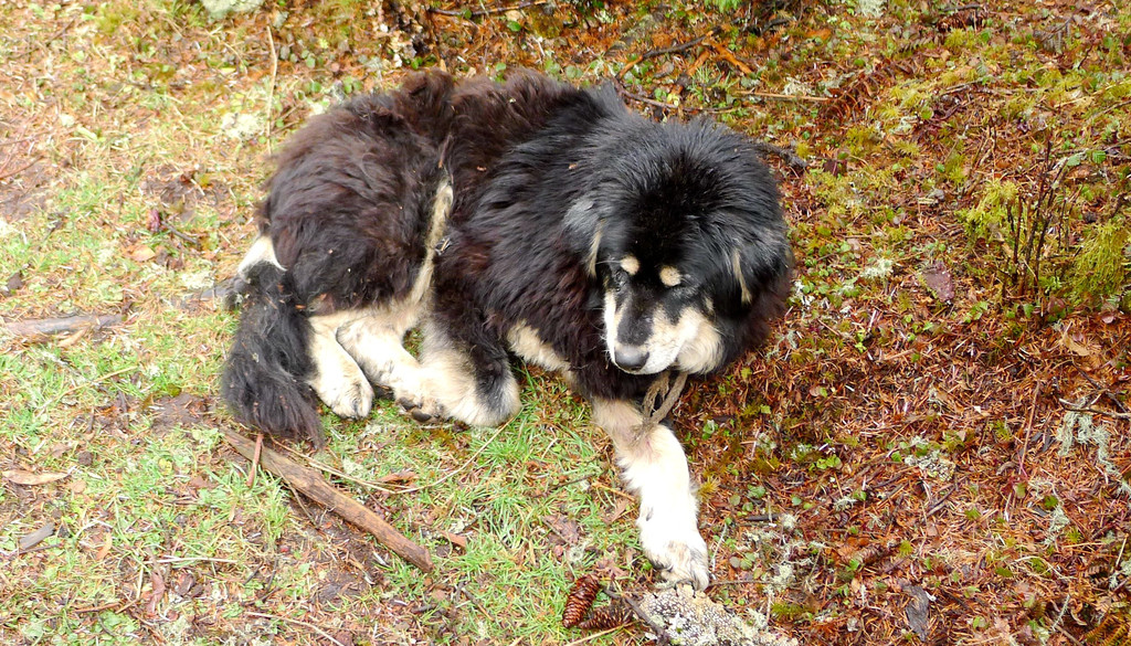 来到一处遍地青苔的地方,感觉颇有原始森林的韵味,于是走下栈道去拍照,其间也是极其小心地避免踩踏小草、小树。栈道旁还有一只大狗,看似藏獒又有点儿不像,一副与世无争的嘴脸,不愿意搭理我们。