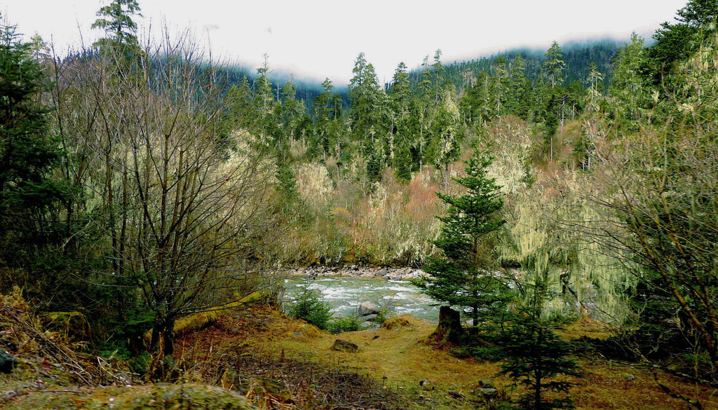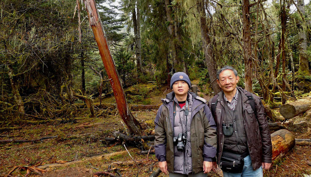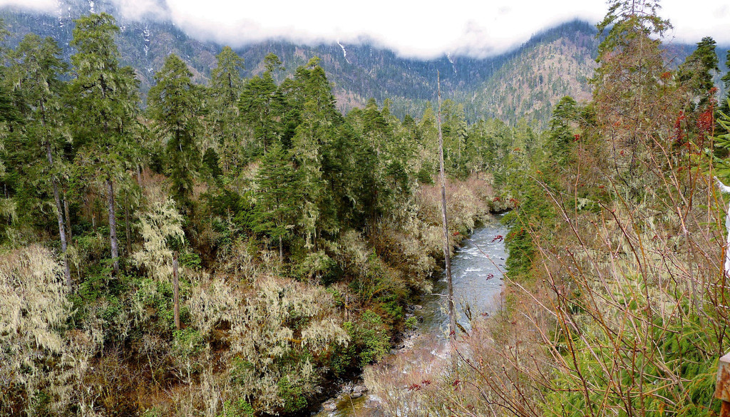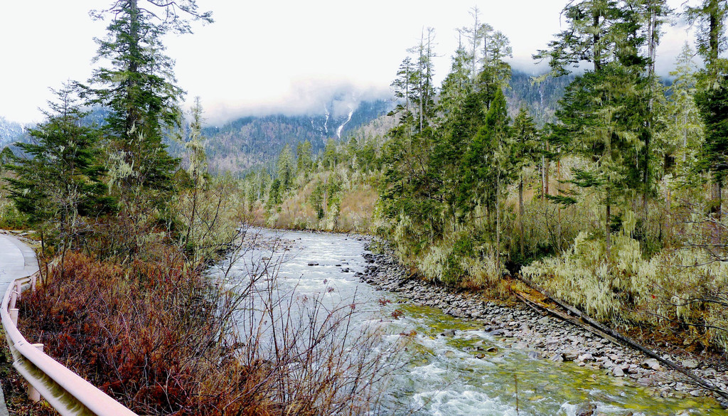 10:55经过一处保安岗亭,听交通车司机说,7座以下的外来小车在购买门票以后就可以直接开入景区,但必须在这里接受检查,早知如此我们也应该让邓师傅把汽车开进来。又行驶了不一会儿,抵达“南伊沟大拐弯”观景台,我们登台眺望,只见脚下碧水滔滔,南伊河从密林深处涌出,在这里拐了一个U形的大弯,又向着幽深的密林流去,消失在葱葱茏茏的原始森林之中。