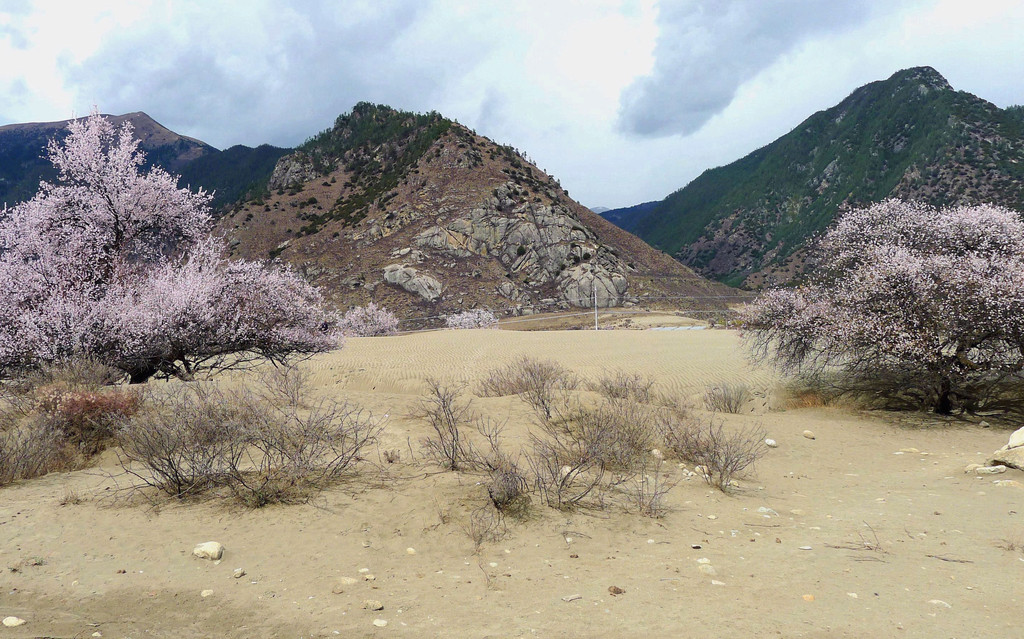 耗罢时间继续前行,不久后看到路边山坡上有大面积的积沙,我感到很奇怪,它们不像是山体崩塌所致,因为积沙上方的树林还都相当整齐。邓师傅说,那些沙子其实是来自旁边的雅鲁藏布江干涸河床,大风把沙子吹上了山。16:02见到一大片沿江沙丘,邓师傅停车,让我门登上沙丘游玩、拍照,他说这里是山南线路上的一处旅游景点。此地的景观也是相当奇特,粗看沙丘起伏好似沙漠一般,但细看却又桃红柳绿,显露出浓浓的春意。